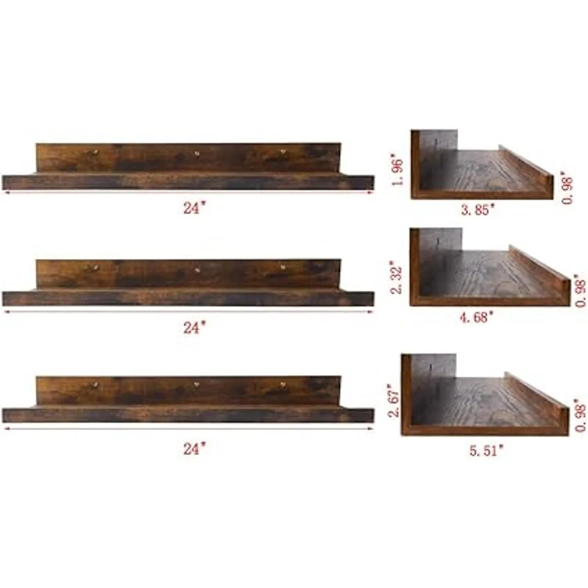 Fácil de instalar: el paquete incluye 3 estantes de madera, 9 tornillos, 1 nivelador y 1 hoja de instrucciones idioma español no garantizado. Los estantes para pared tienen agujeros preperforados y la instalación es fácil para ti con los accesorios de montaje en pared necesarios e instrucciones fácilmente comprensibles. Juego de 3 dimensiones diferentes de estante, grande: 24 x 5.5 x 2.7 pulgadas; mediano: 24 x 4.7 x 2.3 pulgadas; pequeño: 24 x 3.9 x 2 pulgadas.