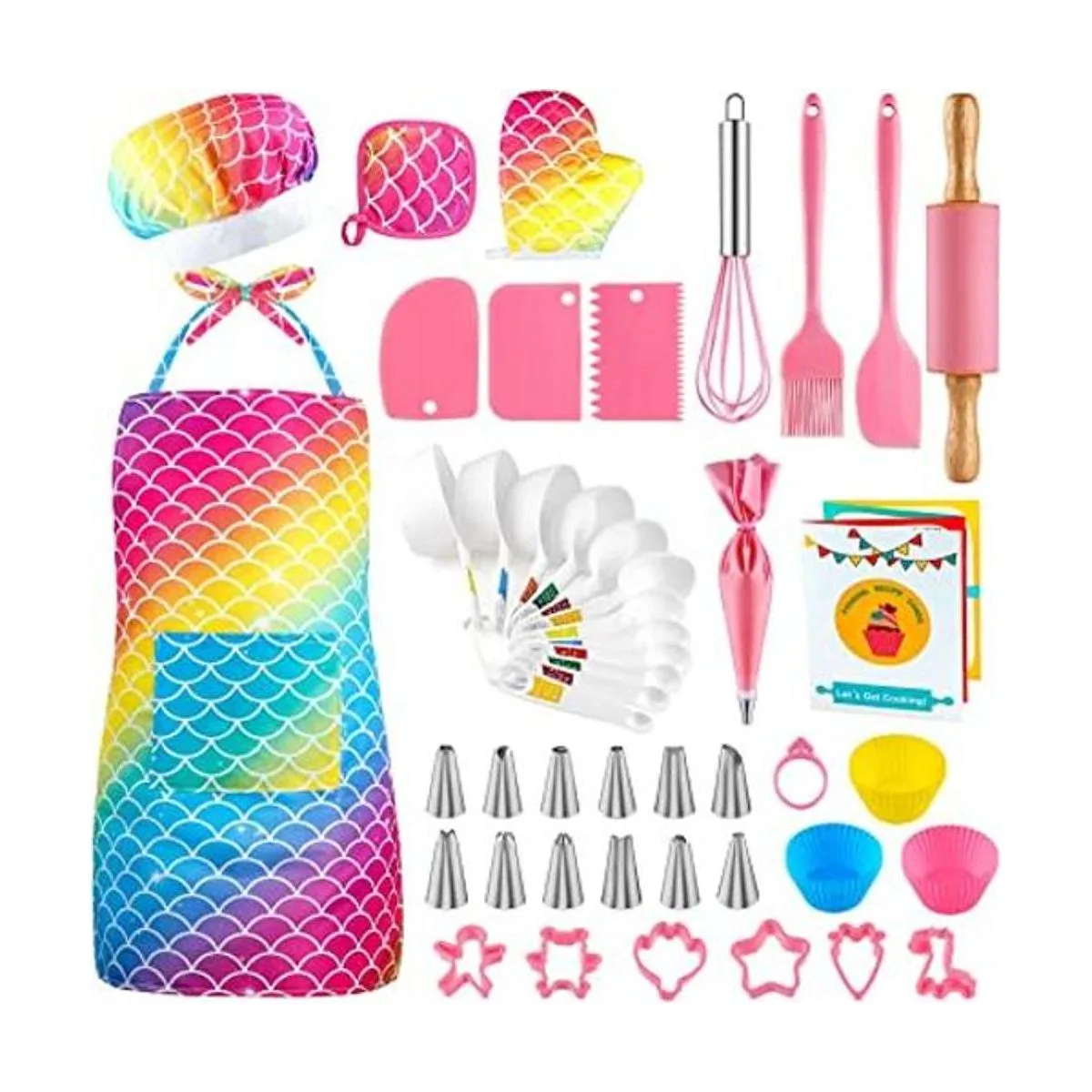 GIFTINBOX Juego de cocina y horneado para niños, kit completo de 54 piezas con delantal y sombrero de chef, utensilios de cocina para niños reales y accesorios de cocina para chef junior, regalo definitivo para hornear para niñas y niños