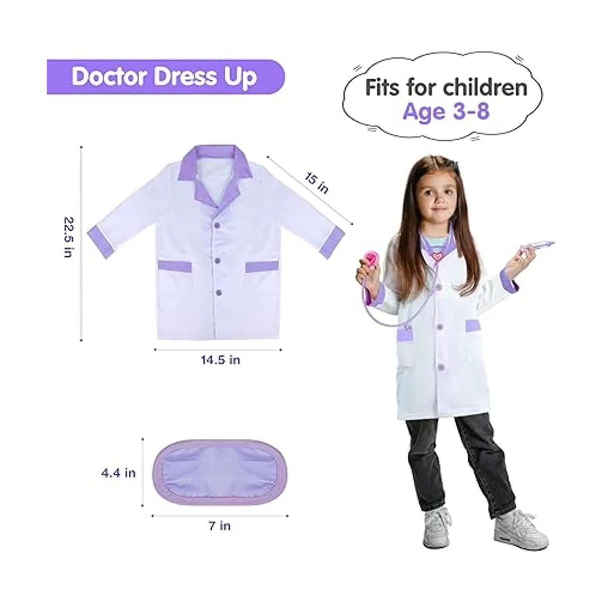 Kit de médicos de mejor valor: para pequeños médicos, dentistas y enfermeras: el juego completo incluye abrigo de médico morado, estetoscopio electrónico de máscara morada, otoscopio, martillo reflectante, espejo oral, termómetro, gafas, alicates médicos, tijeras de médico, pinzas, jeringa, pastillero x 3, ayudas de banda, palo médico y una bolsa de transporte.