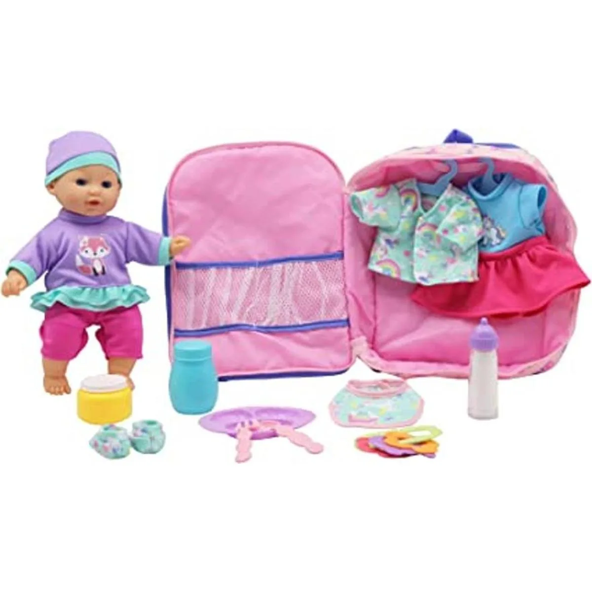 Muñeca de cuerpo suave con cabeza y mano de vinilo, y con chupete, babero, botella de leche mágica, animal de peluche y edredón.