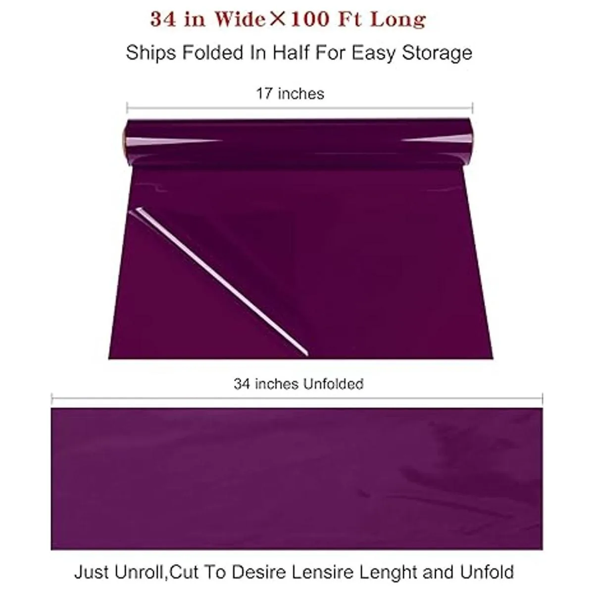 Especificaciones: nuestro celofán morado de 34 pulgadas de ancho se pliega por la mitad y luego se enrolla en un rollo de 17 pulgadas de ancho para el envío. Después de desplegar, el tamaño real es de 34 pulgadas de ancho, 100 pies de largo. suficiente para que lo utilices para más cestas de regalo y envoltura de regalo.