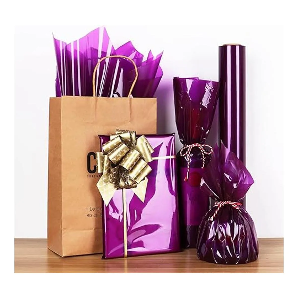 Durabilidad más fuerte: nuestro rollo de celofán morado es inodoro, tiene una superficie ligeramente translúcida, el grosor de 3 mil no es fácil de romper, puede evitar que la humedad y la suciedad entren para una experiencia de regalo segura y fiable.