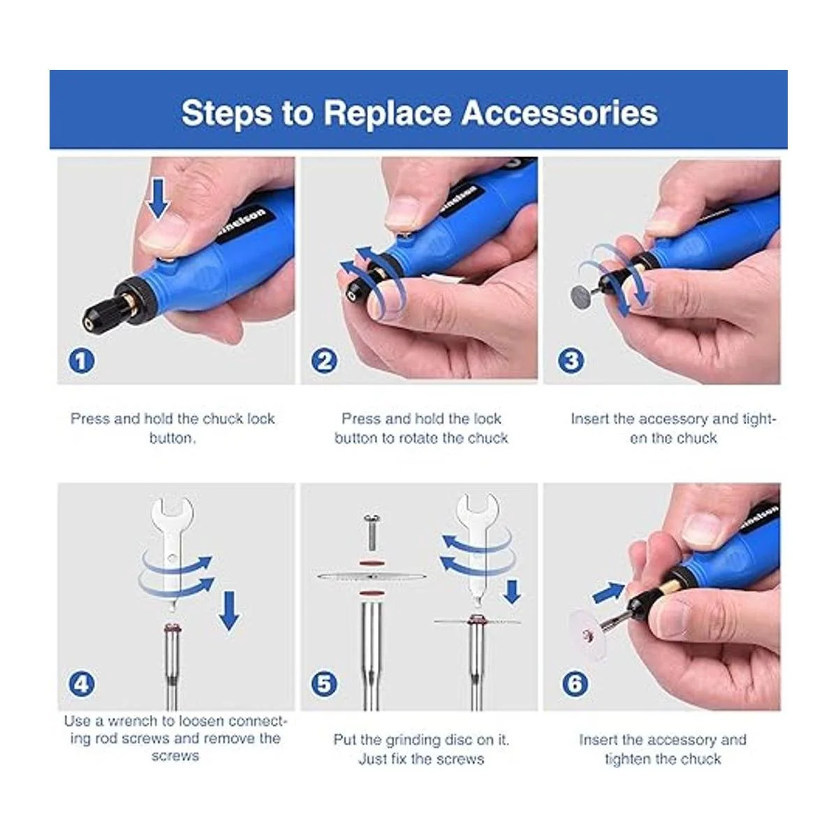 6 tamaños de pinza: esta herramienta eléctrica viene con 6 tamaños de pinza 0.020 in, 0.039 in, 0.059 in, 0.094 in. 0.118 in, 0.126 in, para adaptarse a diferentes accesorios adecuados y se cambia fácilmente. La pinza de 0.094 in o la recogida más pequeña debe apretarse para evitar caídas. Se recomiendan brocas de gran diámetro para pinzas de 0.118 in o pinzas más grandes.
