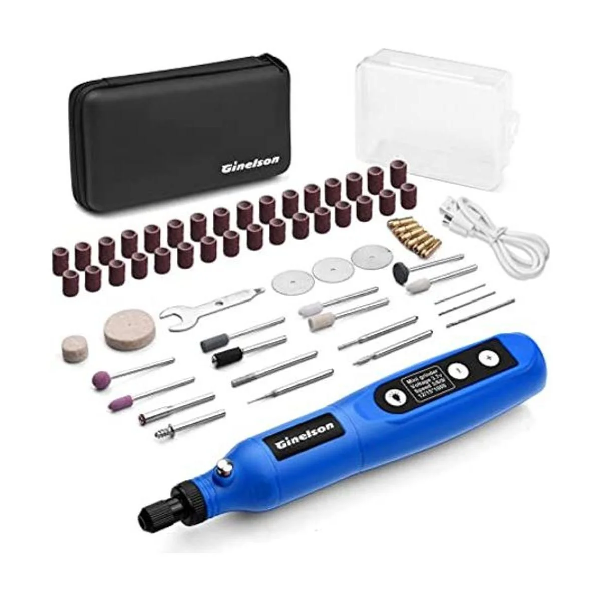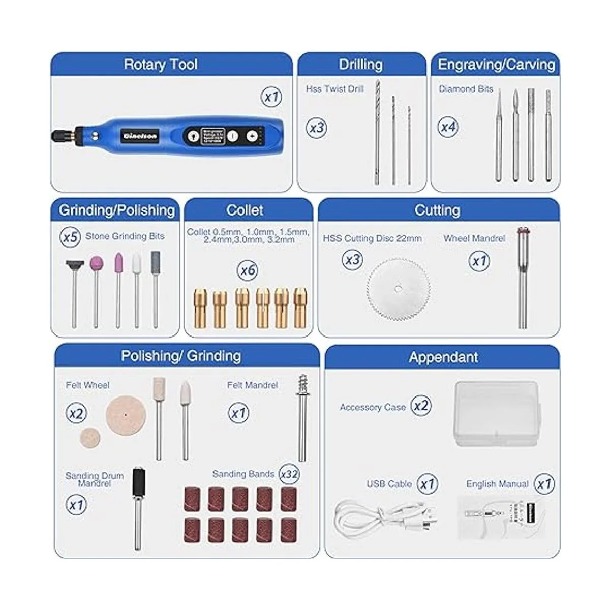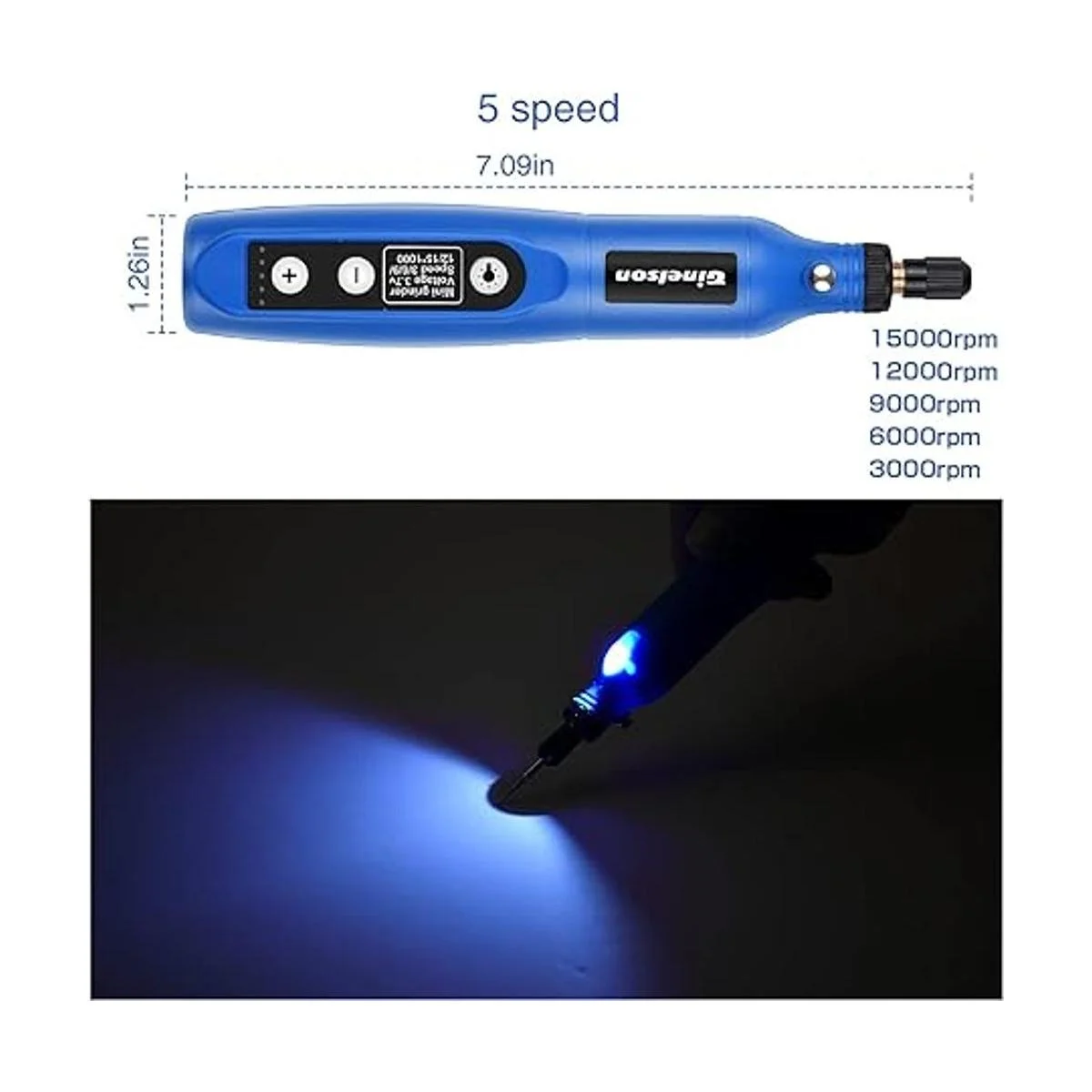 GINELSON Herramienta giratoria inalámbrica, mini kit de accesorios rotativos de iones de litio de 3.7 V con luz LED, herramienta eléctrica de carga USB de 5 velocidades y con 60 accesorios para perforar, grabar, lijar, pulir y cortar