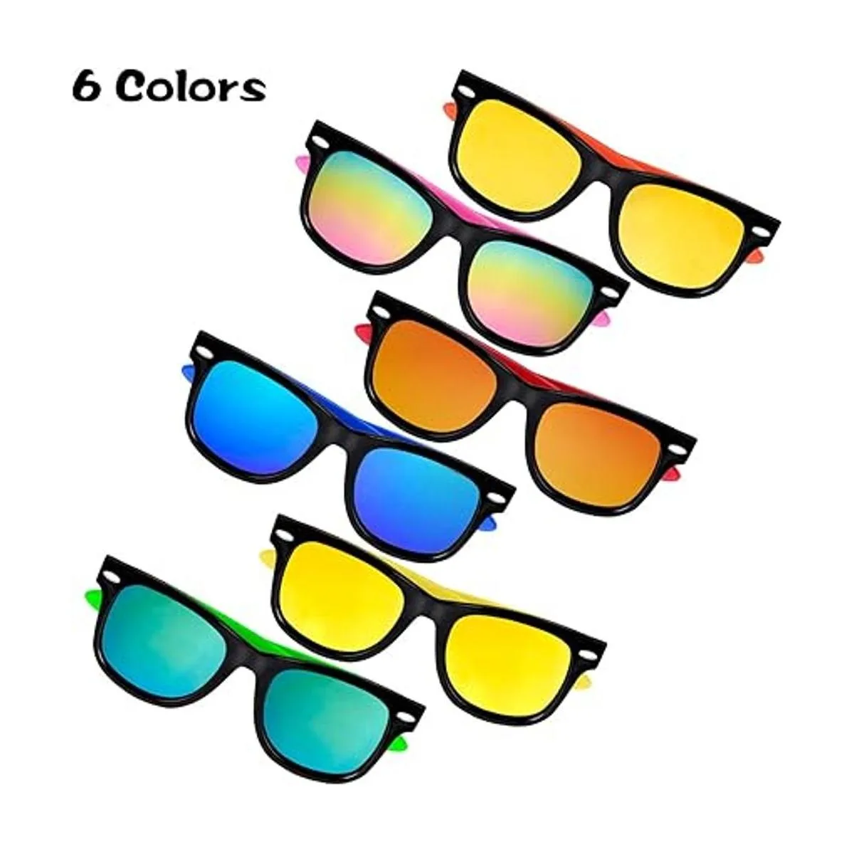 Lentes de sol geniales en colores cálidos Los lentes de sol geniales recuerdan la tendencia de moda de los años 80, vienen en rojo, naranja, amarillo, verde, azul y rosa. Los coloridos lentes de sol permitirán que las niñas y los niños se vuelvan más llamativos en las fiestas de piscina, fiestas de playa y campamento de verano.