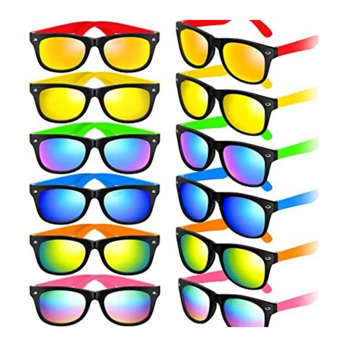 Lentes de sol a granel para niños Nuestros lentes de sol para niños vienen en paquete de 24, es una gran opción para la familia, clase u otras fiestas felices. Las gafas de sol geniales también son un regalo popular para estudiantes al final o al comienzo del semestre. Los lentes de sol neón a granel de 12 paquetes son realmente ganga.