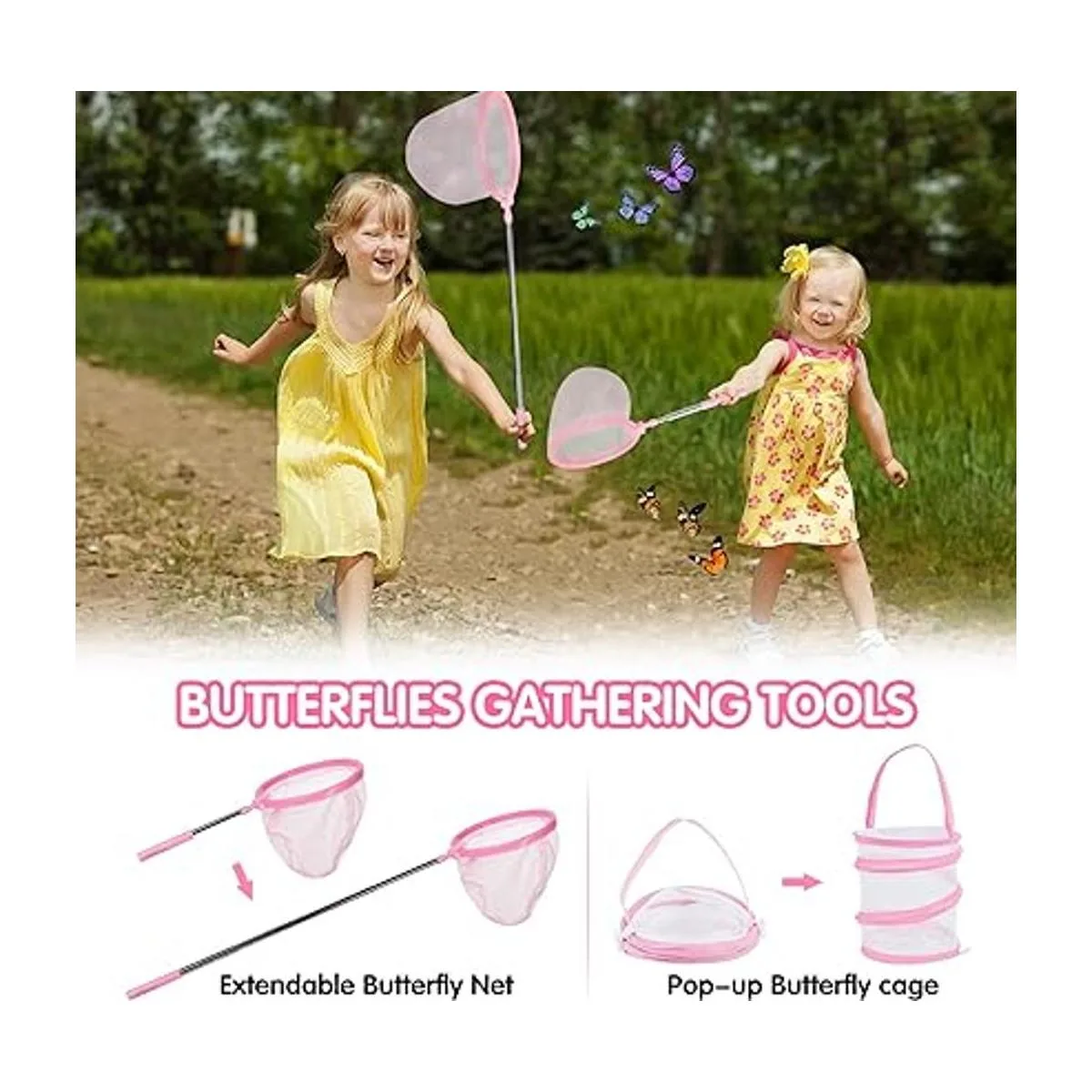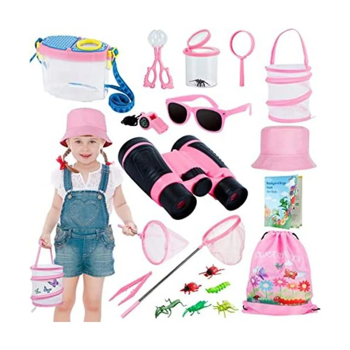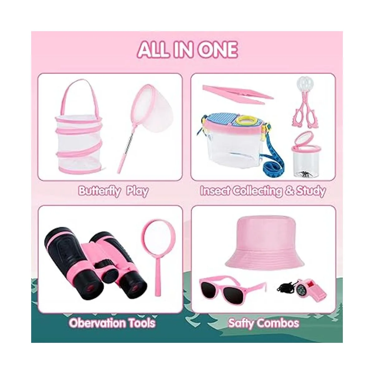 Juguetes de camping para niños y kits de aventura al aire libre: el juego completo de exploración y aventura para niños incluye: sombrero rosa, red telescópica de mariposa y una jaula de hábitat de mariposa emergente, binoculares, lupa, silbato, coleccionista de insectos con lupa, pinzas, pinza para insectos, 1 paquete de insectos falsos y una mochila para llevar todas las cosas.