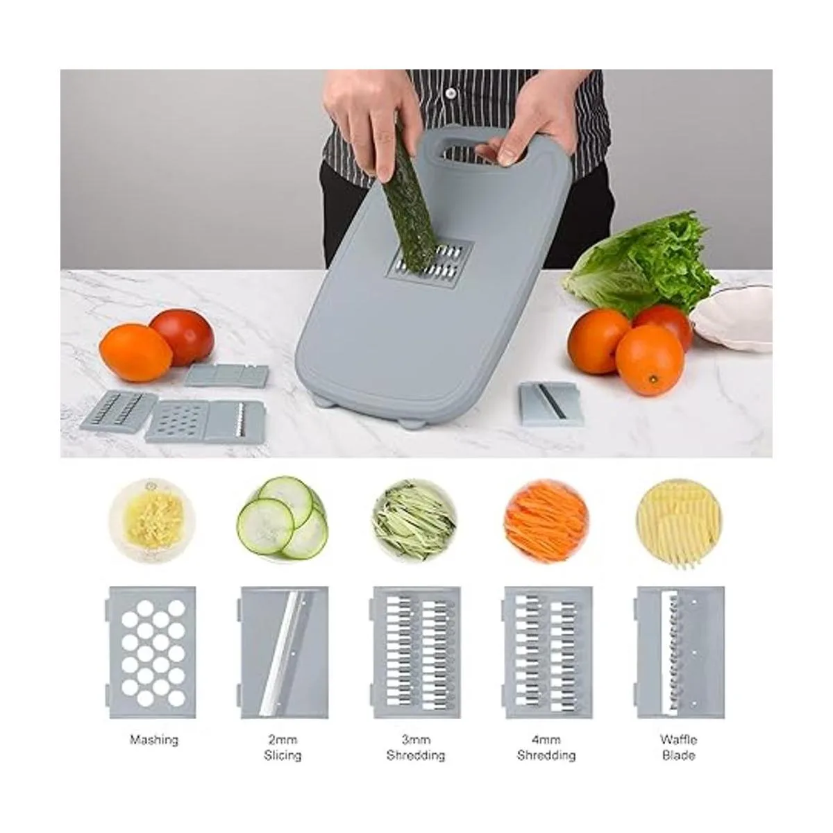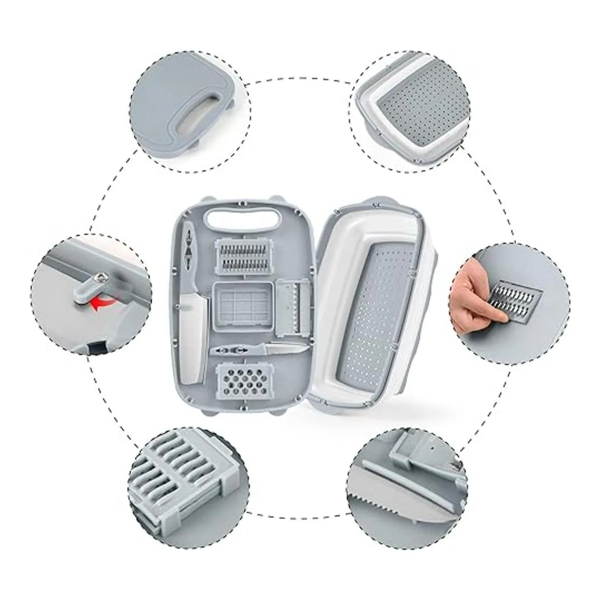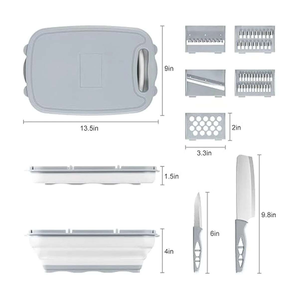 Tabla de cortar multifuncional 9 en 1: esta tabla de cortar de cocina proporciona las funciones de una variedad de herramientas de cocina. Está equipado con 5 cuchillas reemplazables para triturar y rebanar, que también se pueden utilizar como cestas de almacenamiento de alimentos para verduras, frutas y carne, satisfaciendo casi todas tus necesidades.