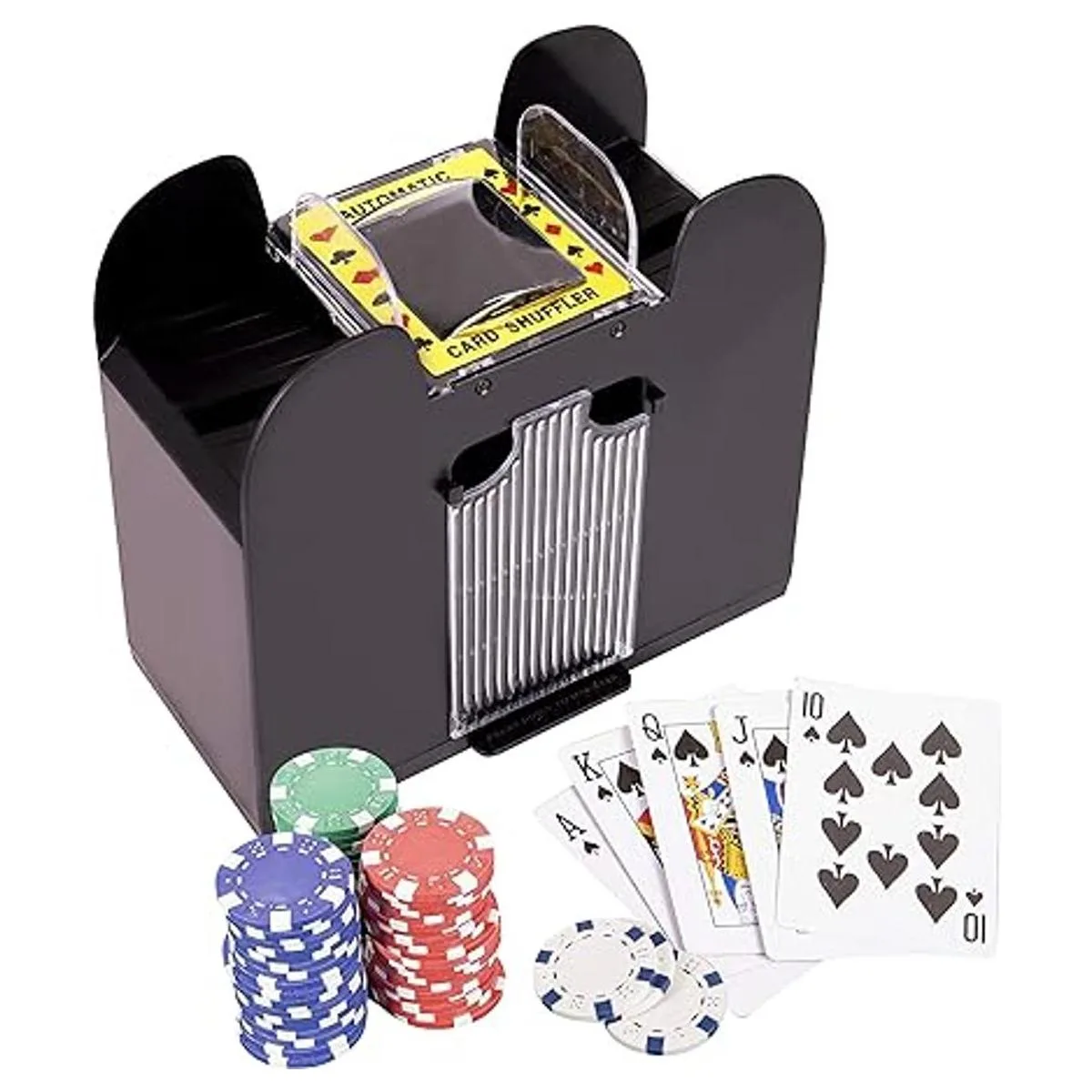 FOCUS ON PLAYING: Giraffe Manufacturing Automatic Card Shuffler lets you concentrate on your cards instead of shuffling the cards evenly. Powered by 4 Csized batteries not included, this automatic shuffler for 2 card decks saves you work and time. With a tool to do the shuffling, your mental focus and hand dexterity are directed at winning. No worries about organizing cables or setting up an extension cord to operate this shuffler.