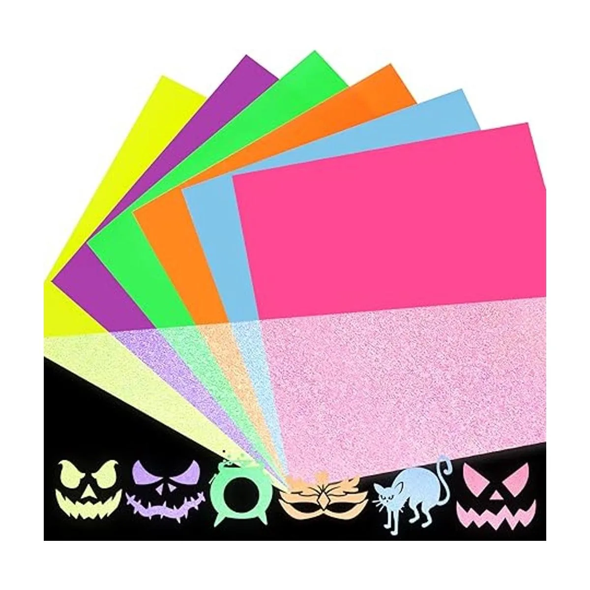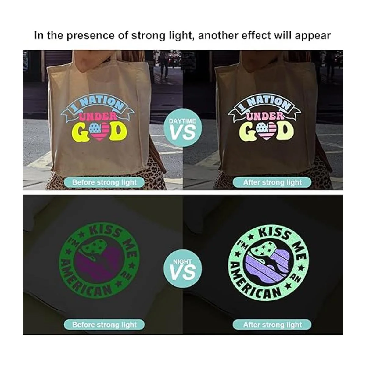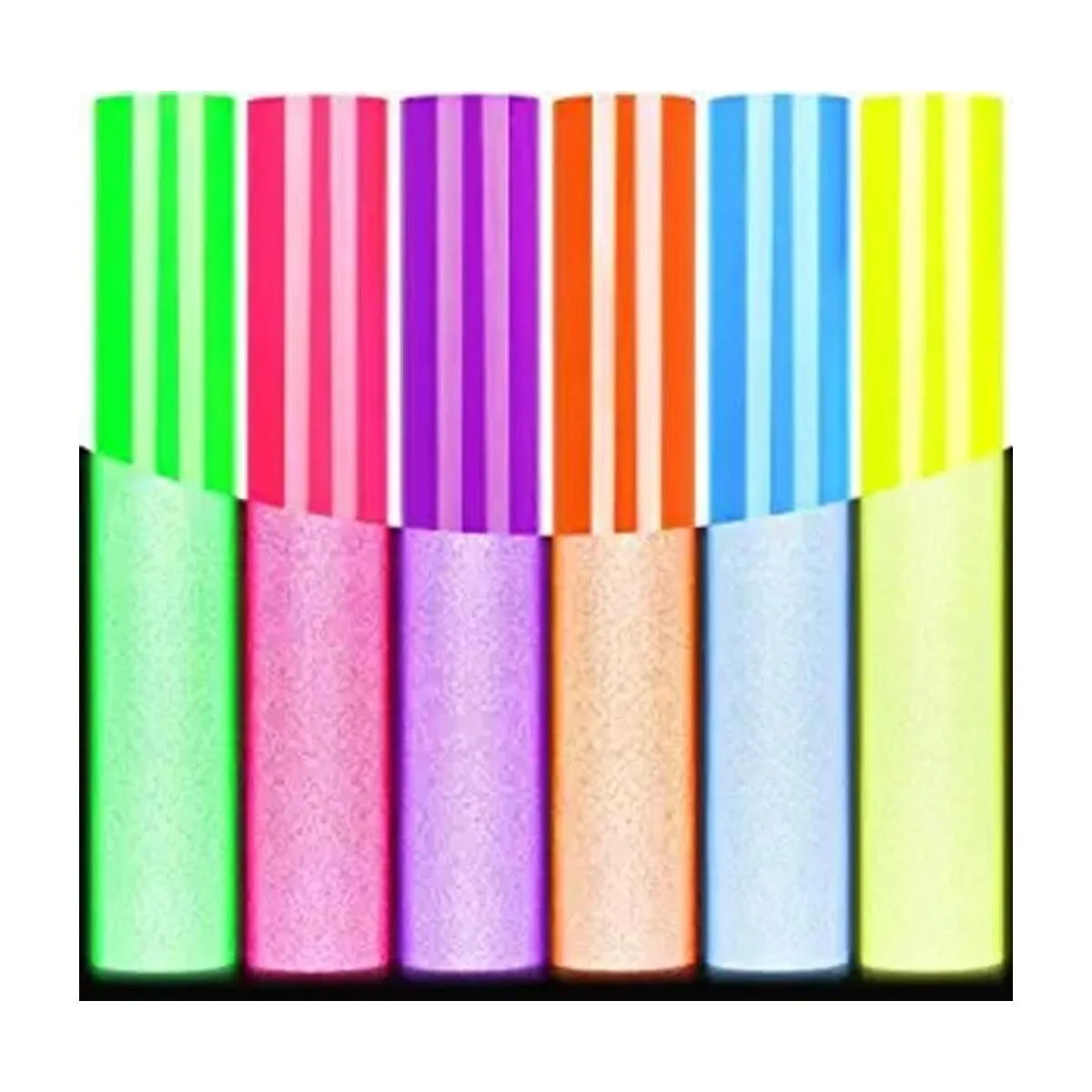 Hojas reflectantes de vinilo HTV: Este es un paquete de vinilo de transferencia de calor de poliuretano neón de varios colores, la diferencia es que por la noche o en la oscuridad, el vinilo de 6 colores fluorescentes reflejará 7 colores diferentes cuando se expone a luz brillante en la oscuridad. Su portador es de material PET de alta calidad, no deformable con una ligera viscosidad, que tiene excelentes funciones de corte y deshierbe.