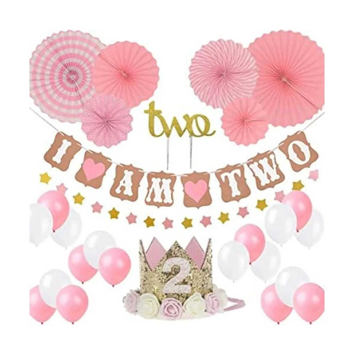 Girl Two Birthday DecorationBaby Girlboy 2st Birthday Party Hat Princess Tiara Crown, Cake Topper Two, I Am Two and Stars Banner, Pink Hanging Paper Fan Flower, Pink and White Balloons