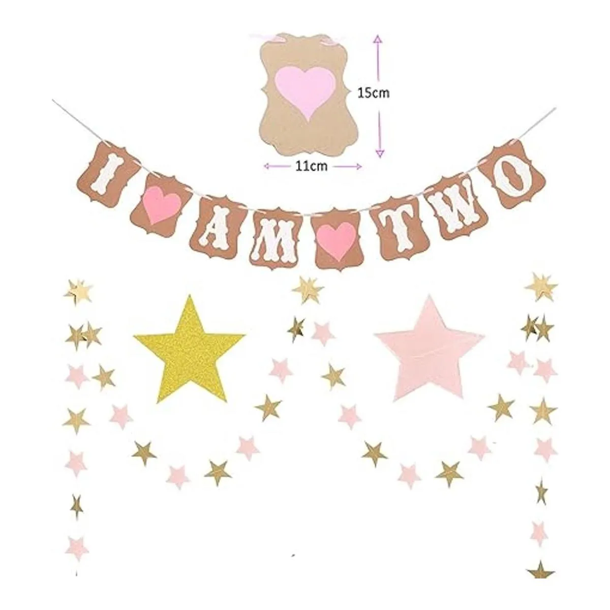 IAMTWOBannerEach Card Measures Approx 12x12cm / 4.7×4.7 inch.Rope length: Approx 3.0 yd ,Long enough to hang. Assembly required. All elements are flush with the first pictureEach pack also comes with a gold and pink star banner to decorate your party. Make your party brighter.