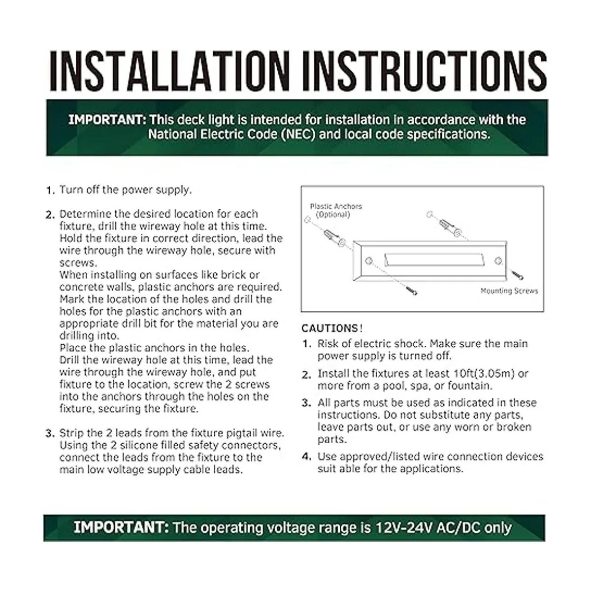Funcionamiento seguro y rendimiento fiable: voltaje de funcionamiento de 1224 V, sin riesgo de descarga eléctrica. No hay necesidad de reemplazar las bombillas con chips LED de larga duración. Debe ser alimentado por transformador de bajo voltaje de 1224 V no incluido