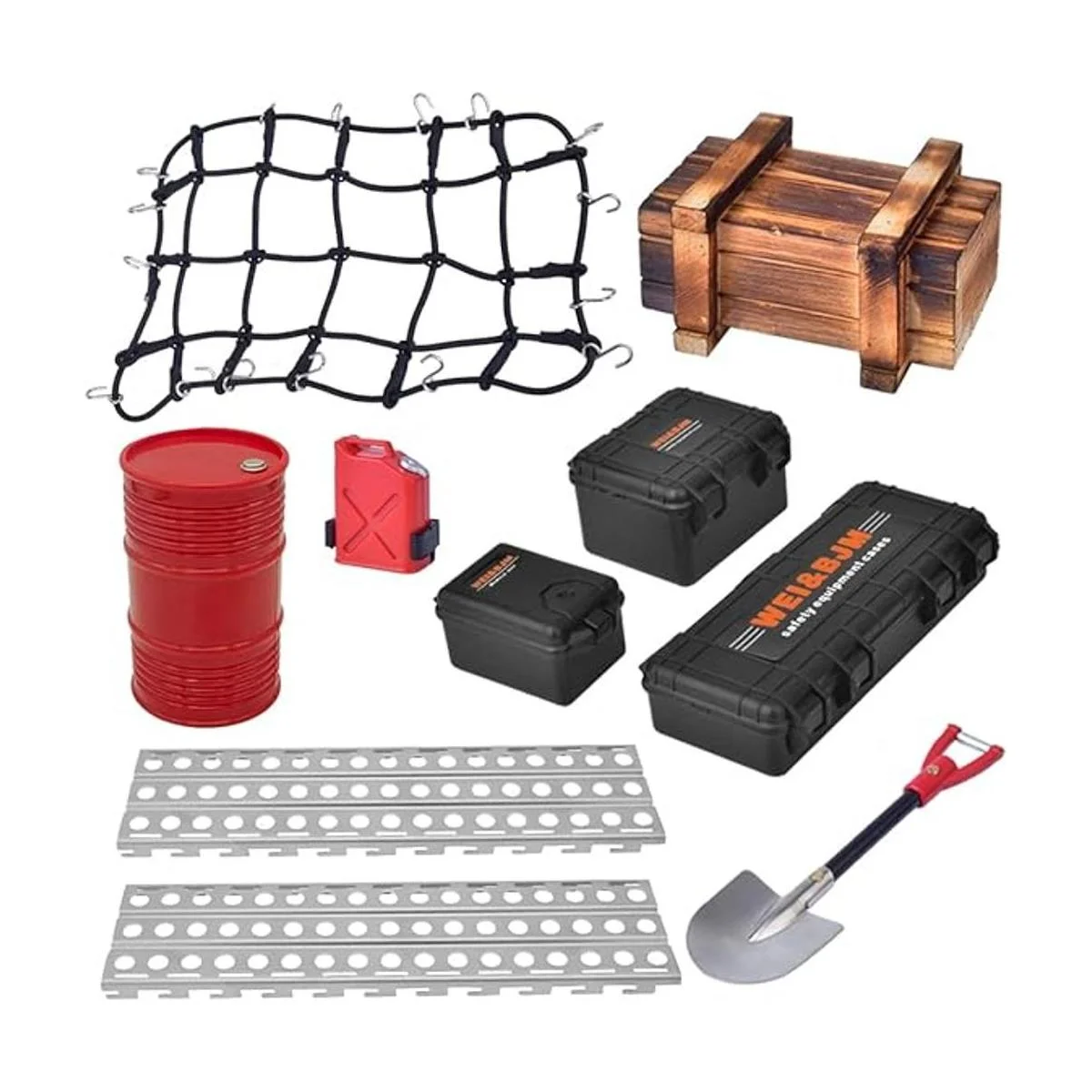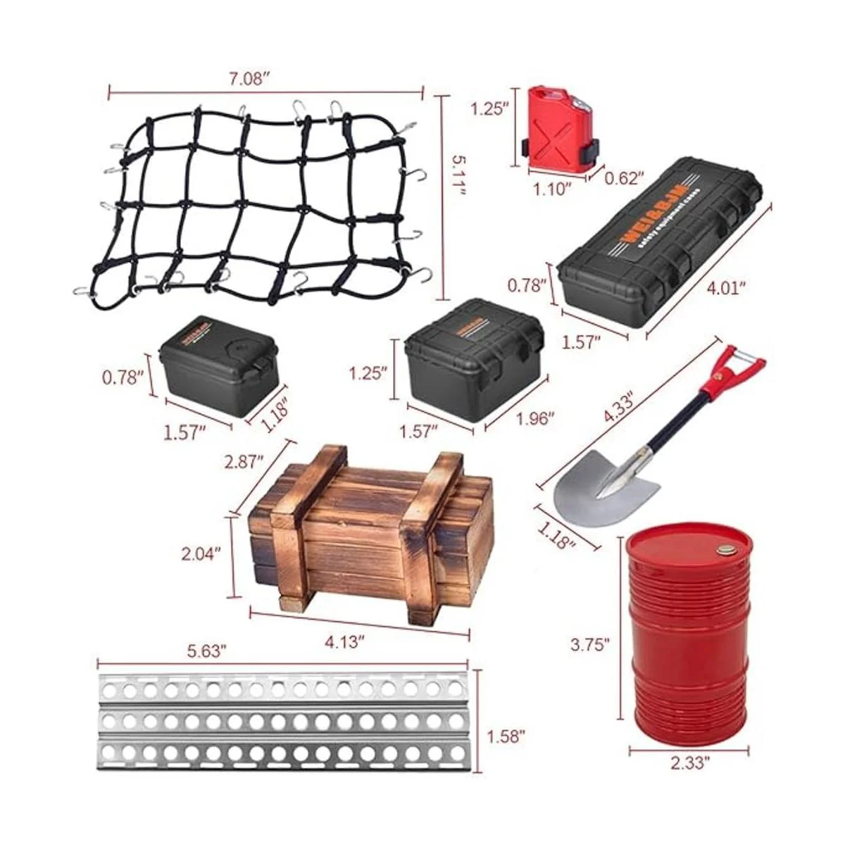 GLABACT 10 unidades de red de equipaje, tambor de aceite, caja de madera, depósito de combustible, caja de herramientas, caja de herramientas, pala para RC 110 Traxxas Trx4 Trx6 AXIAL SCX10 Redcat GEN 7 8 Rc4wd Accesorios