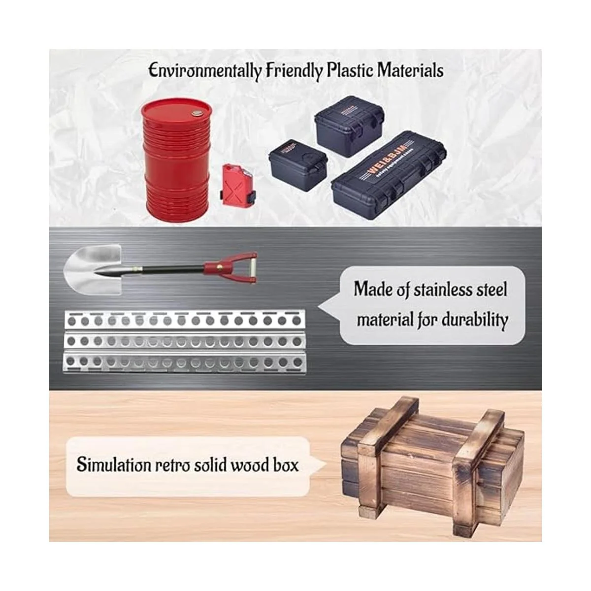 Lo que obtienes: 1 red de equipaje, 1 tambor de aceite, 1 caja de madera, 1 tanque de combustible, 2 tablas de recuperación, 3 cajas de herramientas, 1 pala, este juego de decoración de orugas RC se puede utilizar como un regalo para amigos que aman los modelos de coche.