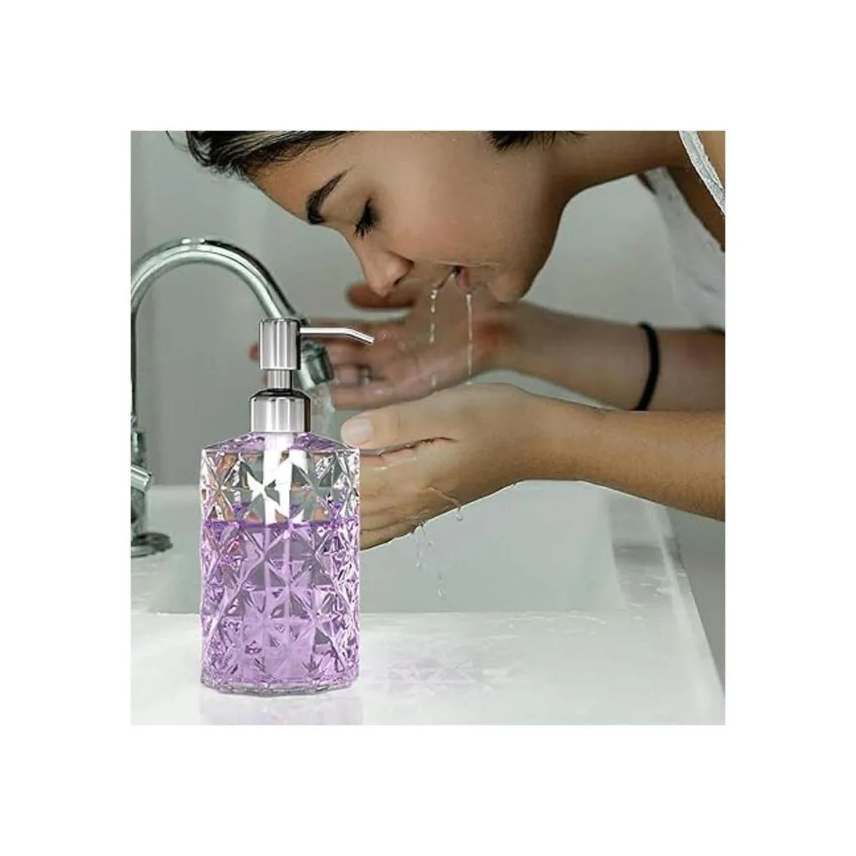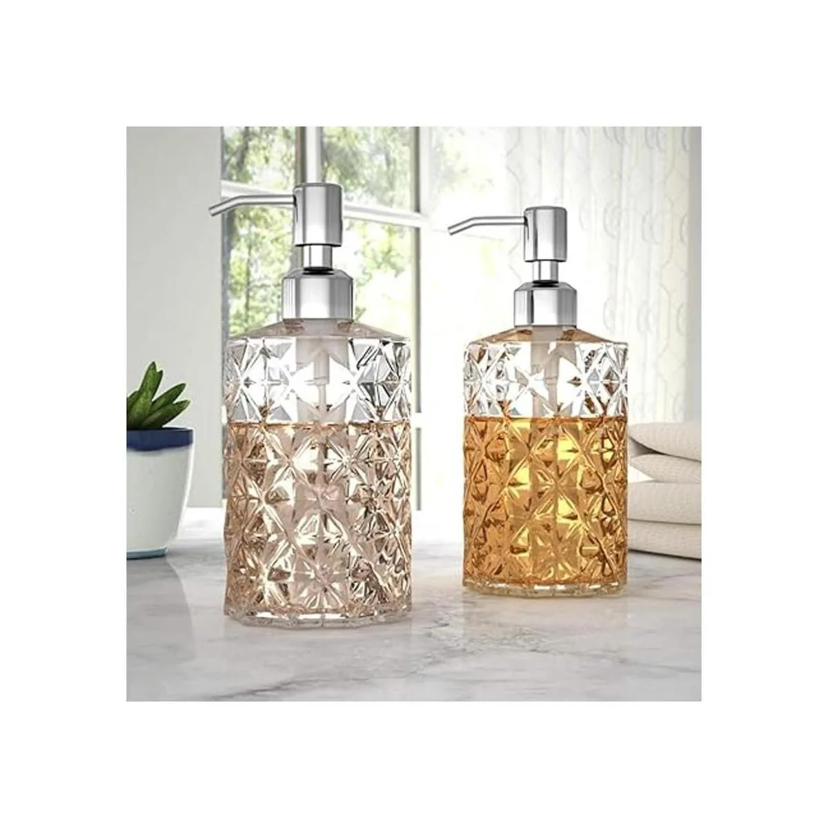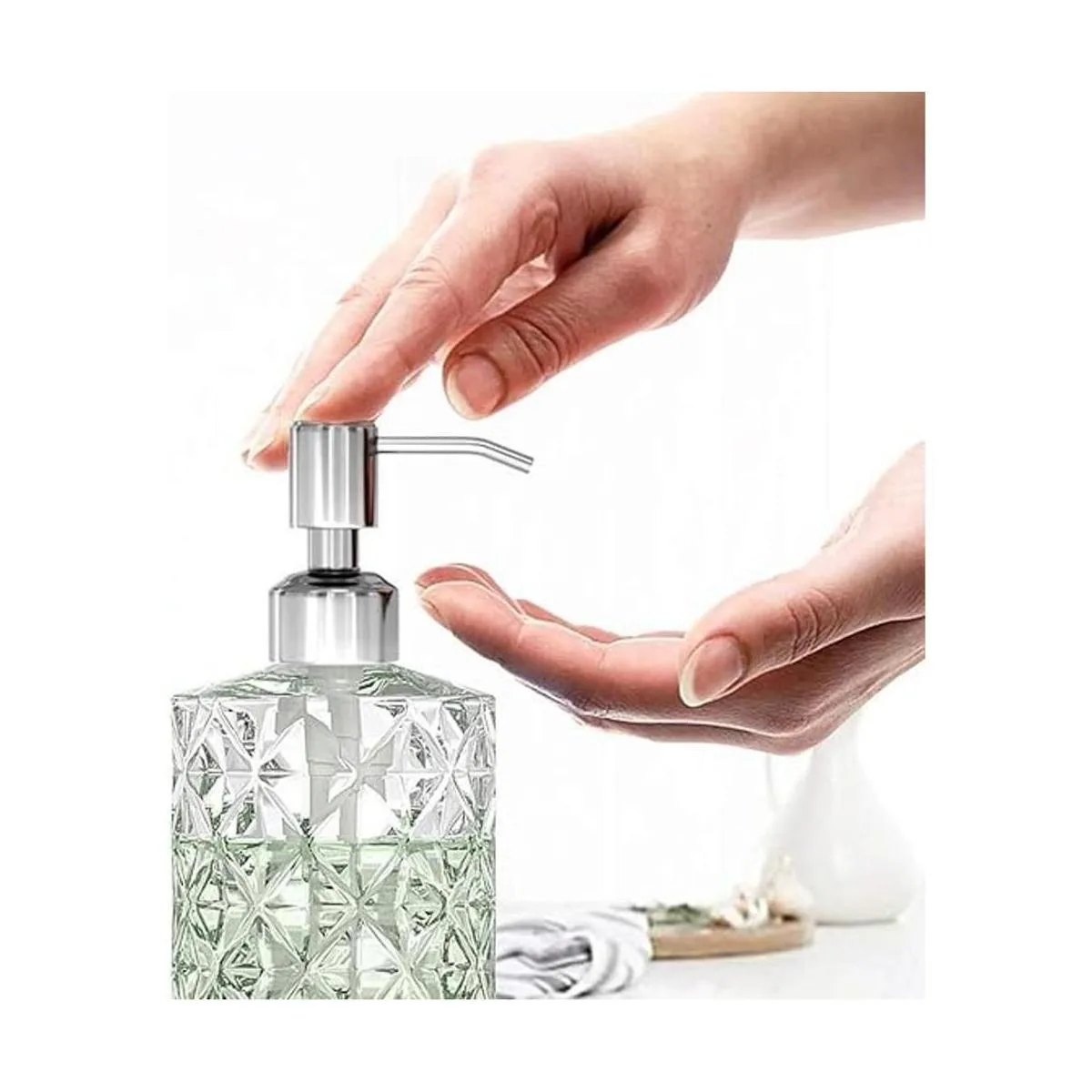 Dispensador de jabón de alta calidad: hecho de vidrio de alta calidad, natural y seguro de llenar con una variedad de líquidos de uso diario a temperatura ambiente. Antihuellas, la bomba resistente está hecha de acero inoxidable 304 de alta calidad que puede mantener un brillo de larga duración que no se corroe ni se oxida fácilmente.