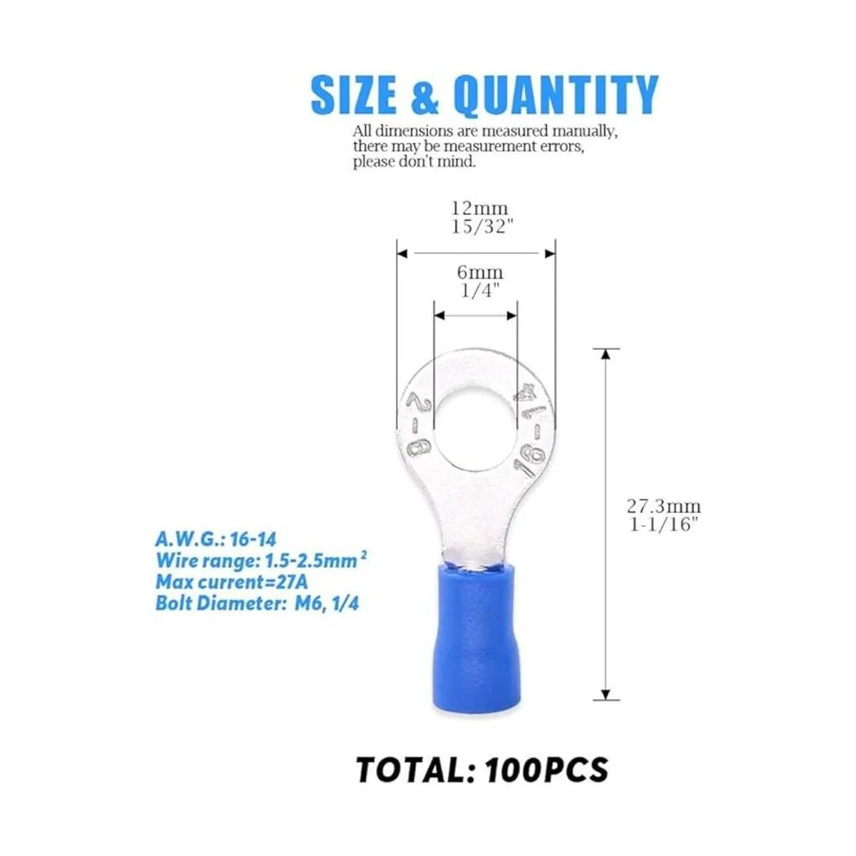Glarks 100pcs 1614 calibre M6 anillo eléctrico aislado rápido empalme terminales conectores de engarzado