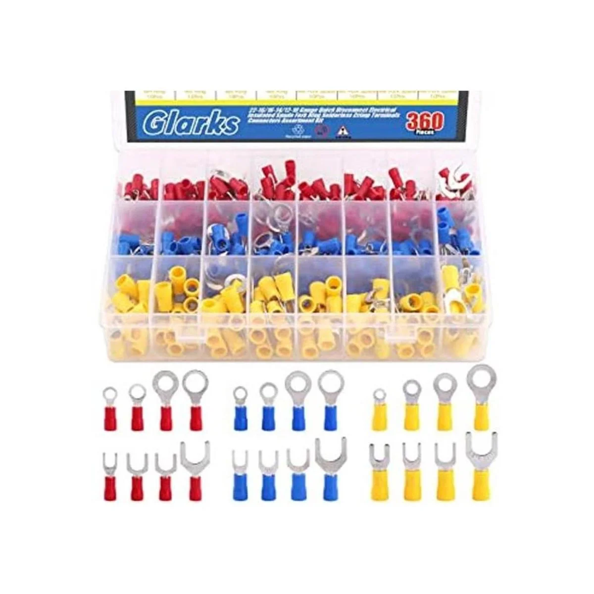 glarks 360pcs 22 1616 1412 10 Gauge terminales de aislamiento Spade Tenedor Anillo sin soldadura Crimp eléctricos de desconexión rápida Conectores Kit Surtido