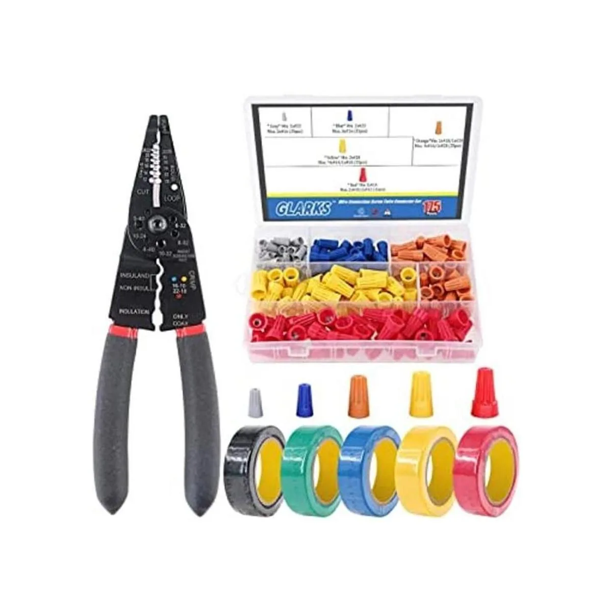 Glarks 8.0 in 1022 AWG Multifunción de pelacables, crimpadoracortador y 175 piezas de tuercas torcidas Conectores de cable eléctrico Terminales de tornillo con 5 piezas de cinta eléctrica Surtido Set