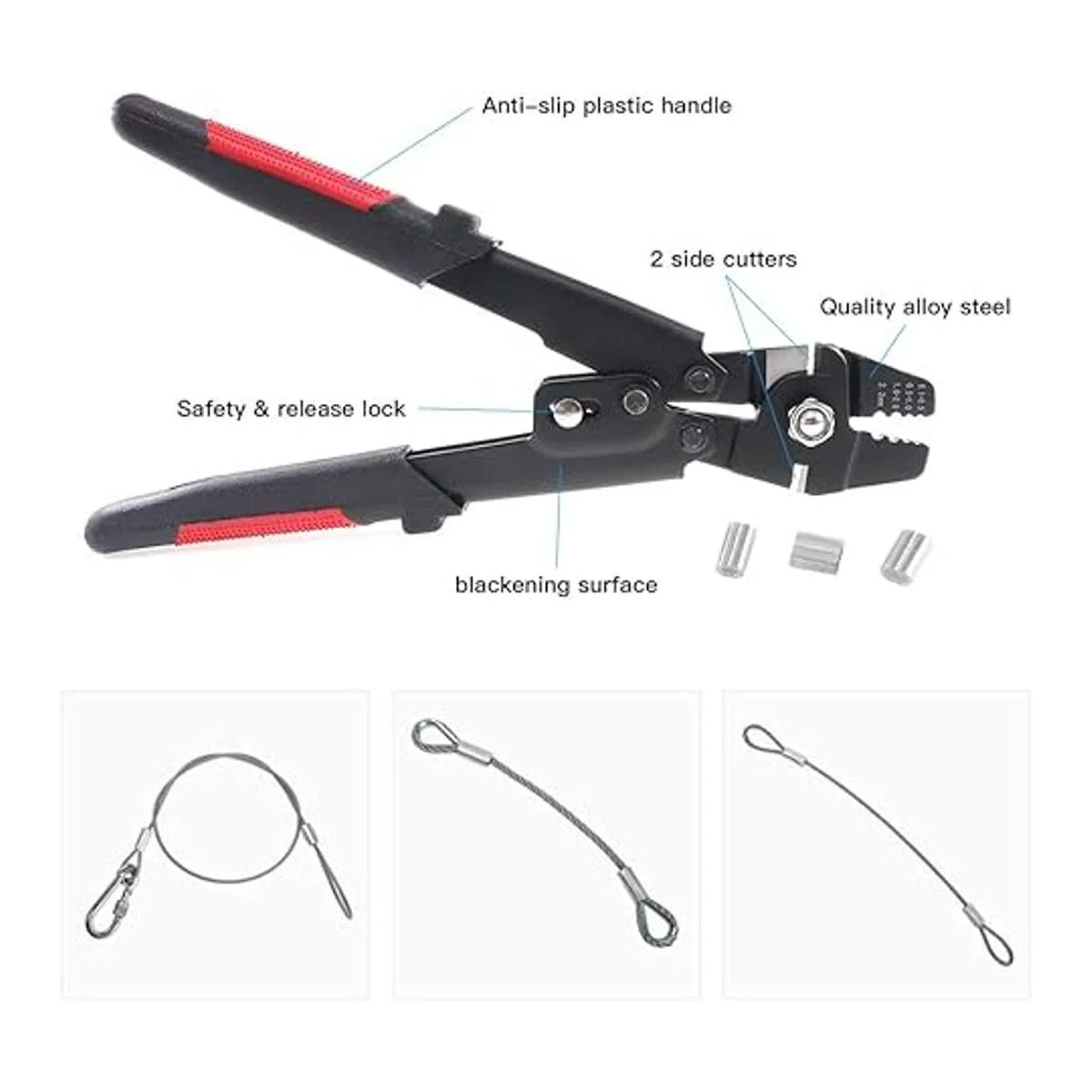 Aplicación: la herramienta de crimpado de pesca está hecha de alta calidad, viene con una funda de crimpado de 3 tamaños, se puede utilizar ampliamente para cuerda de alambre, correas de perro, etc.