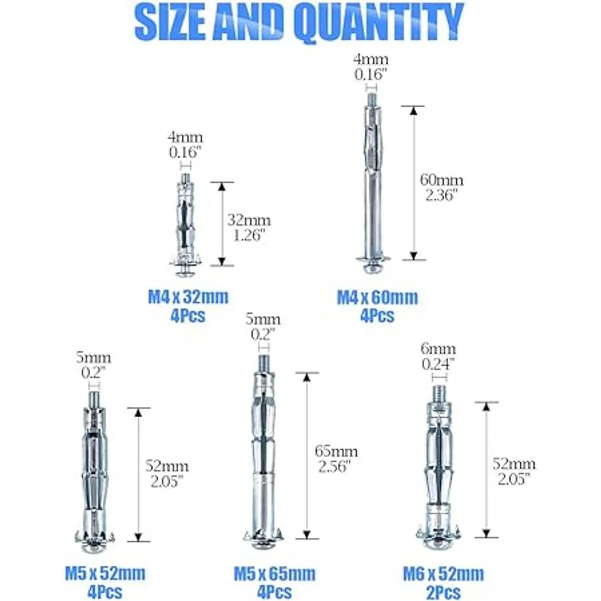 Paquete: en este kit, incluye una resistente con 5 tamaños de 0.157 x 1.260 in, 0.157 x 2.362 in, 0.197 x 2.047 in, 0.197 x 2.559 in, 0.236 x 2.047 in, total de 18 tornillos Molly empaquetados en una caja duradera, conveniente para su uso y almacenamiento.