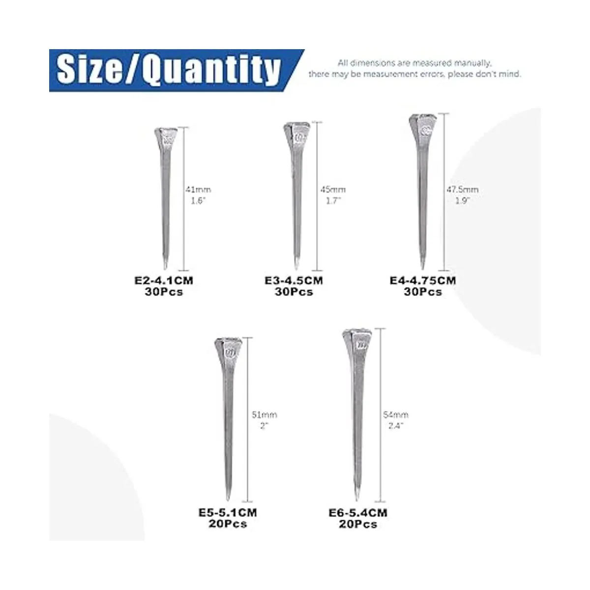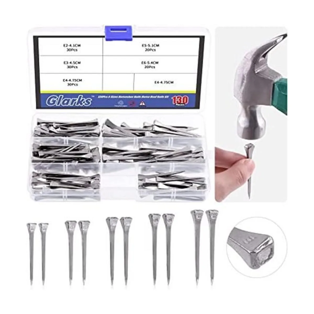 Glarks Juego de 130 Uñas de herradura E2 E3 E4 E5 E6 Surtidos de Uñas de herradura de 1.614 in, 1.772 in, 1.870 in, 2.008 in, 2.126 in, herramientas de herradura de acero para entrenamiento de caballos y deportes ecuestres