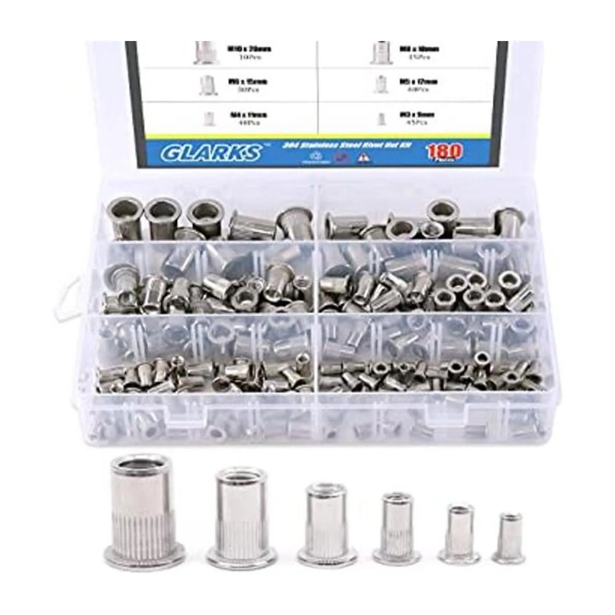 Glarks Juego de 180 piezas de acero inoxidable 304, cabeza plana, roscada, remache, inserto, tuerca, kit surtido M3 M4 M5 M6 M8 M10