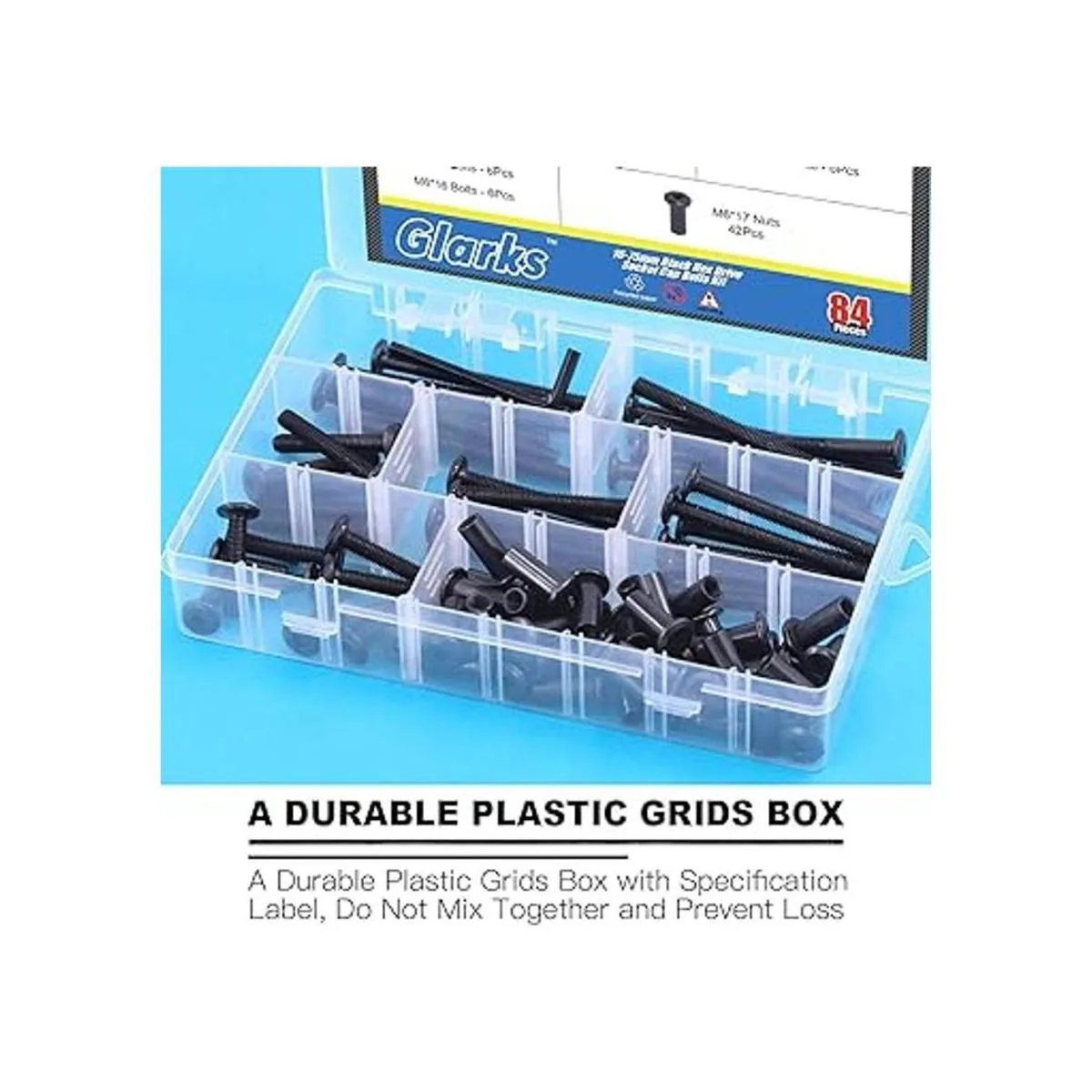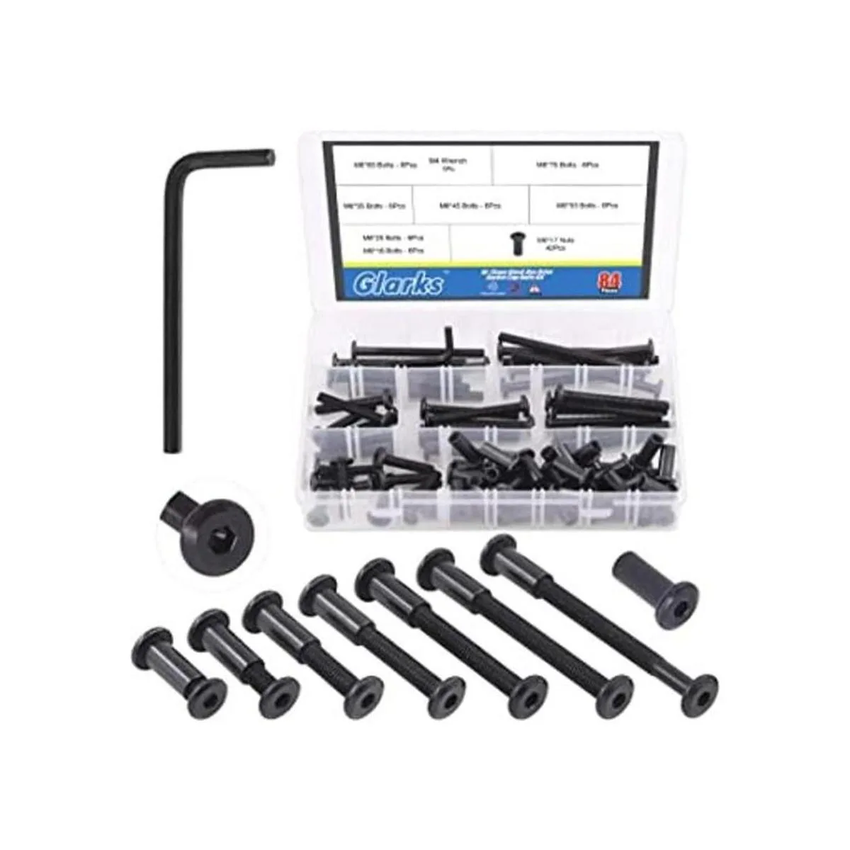 Glarks Juego de 85 tornillos de tapa hexagonales negros M6x1625354555652.953 in, cabeza Allen, muebles de cabeza conteada, tornillos de cuna, tuercas para gabinetes de mesa de silla