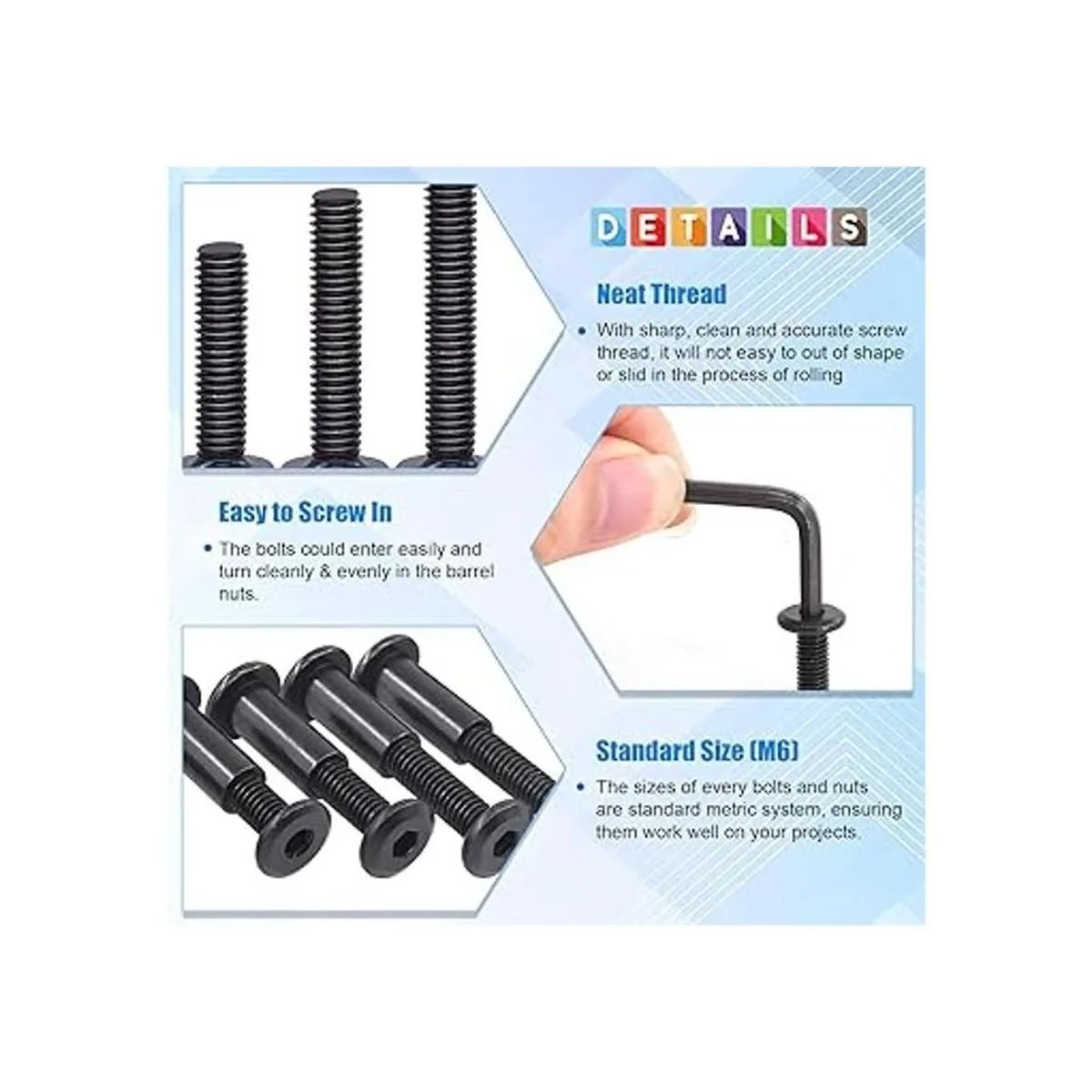 Múltiples tamaños: el kit incluye pernos hexagonales M6, 0.630 in, 0.984 in, 1.378 in, 1.772 in, 2.165 in, 2.559 in, 2.953 in, cada uno para 6 piezas; tuercas de barril M6 x 0.669 in para 42 piezas y una llave Allen. Un buen surtido de tamaños que te ayudaron a combinar y encontrar todos los pernos y tuercas que querrías, y no necesitas comprar una llave Allen adicional.