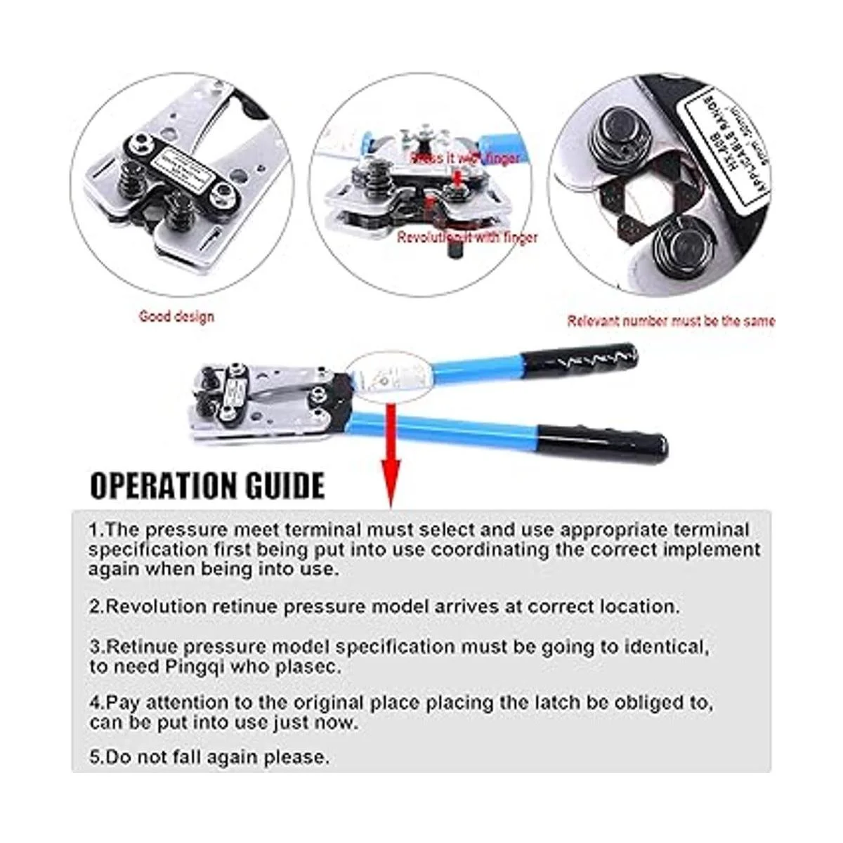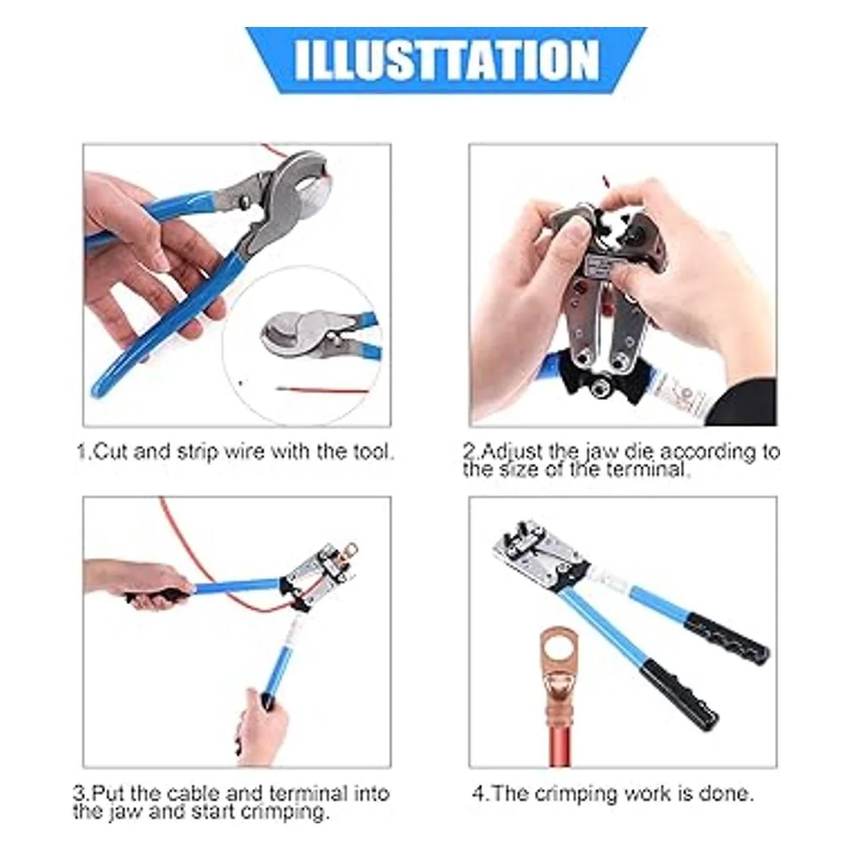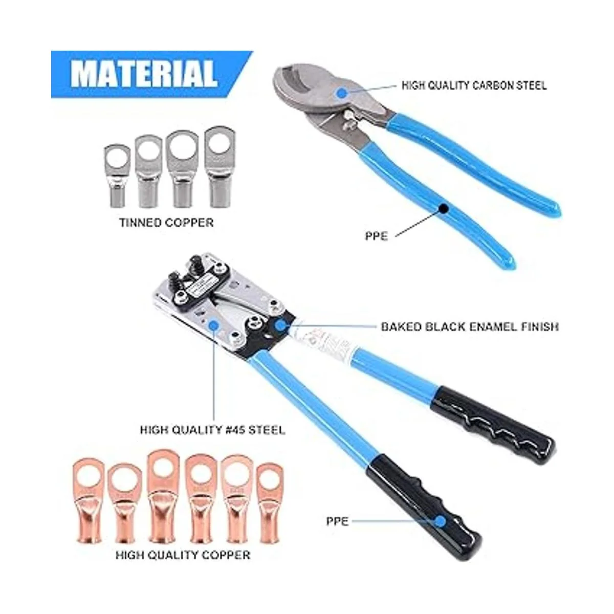Durable Quality : This cable crimper is made of high quality 45 steel, sturdy and durable to use, specially thicken and reinforce the metal plate on crimp head to be stronger. All the wire lugs are made of copper with high conductivity.