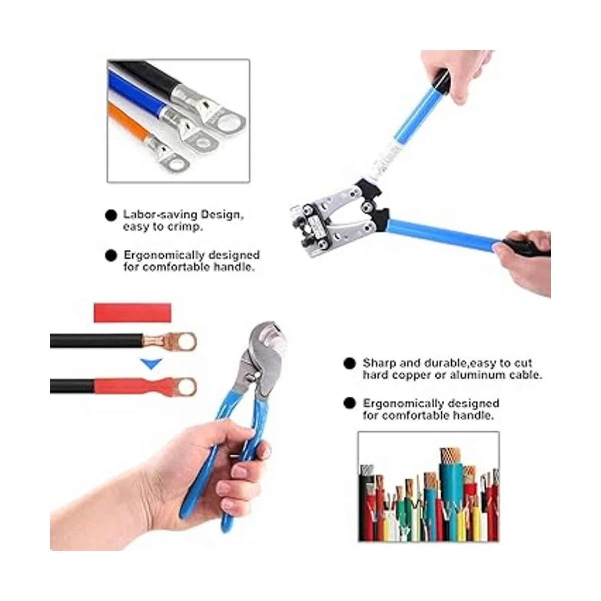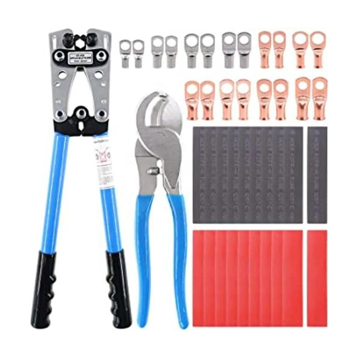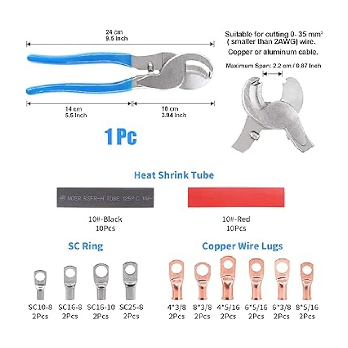 What You Get : In this crimping tool set, we offer a professional lug crimper and a cable wire cutter, 20pcs wire ring lugs, 20pcs black red heat shrink tubing, can work for most heavy stripping and crimping work, they were well packed in a paper box.