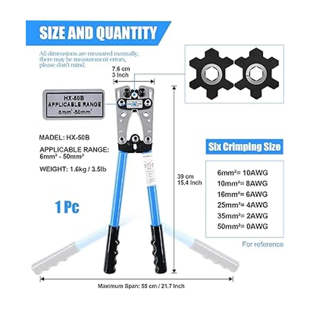 ROTATE CRIMP DIES : The professional cable terminal crimping tool has 6 dies for 6mm/10mm16mm/25mm/35mm/50mm Similar to AWG 10/8/6/4/2/0 wire size crimping, using rotating heads with a spring loaded locking pin to keep the heads in place.