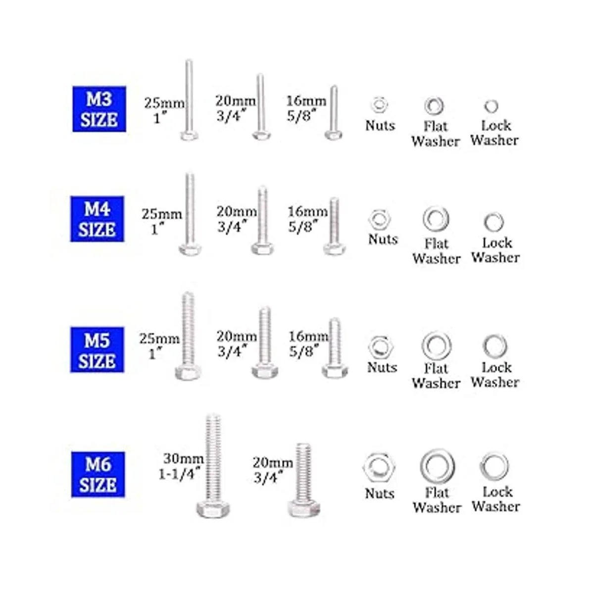 3. El paquete incluye: Diferentes tamaños de tornillos M3 M4 M5 M6 tuercas de junta plana arandelas de resorte en total 665 piezas en una caja transparente que son comúnmente utilizados, fácil de usar e instalar.