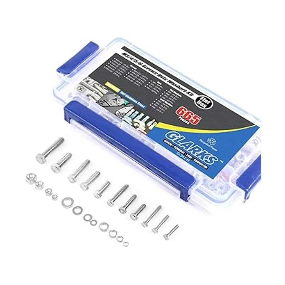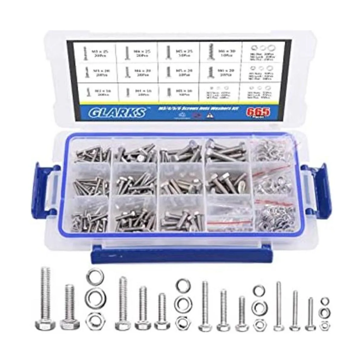 Glarks Juego surtido de 665 tornillos de cabeza hexagonal plana de acero inoxidable M3 M4 M5 M6 tuercas y arandelas de resorte de junta plana
