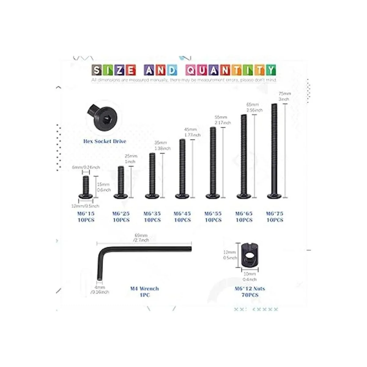Múltiples tamaños: el kit incluye pernos hexagonales M6, 0.591 in, 0.984 in, 1.378 in, 1.772 in, 2.165 in, 2.559 in, 2.953 in, cada uno para 10 unidades; tuerca de barril M6 x 0.472 in para 70 piezas y una llave Allen. Un buen surtido de tamaños que te ayudaron a combinar y encontrar todos los pernos y tuercas que querrías, y no necesitas comprar una llave Allen adicional.