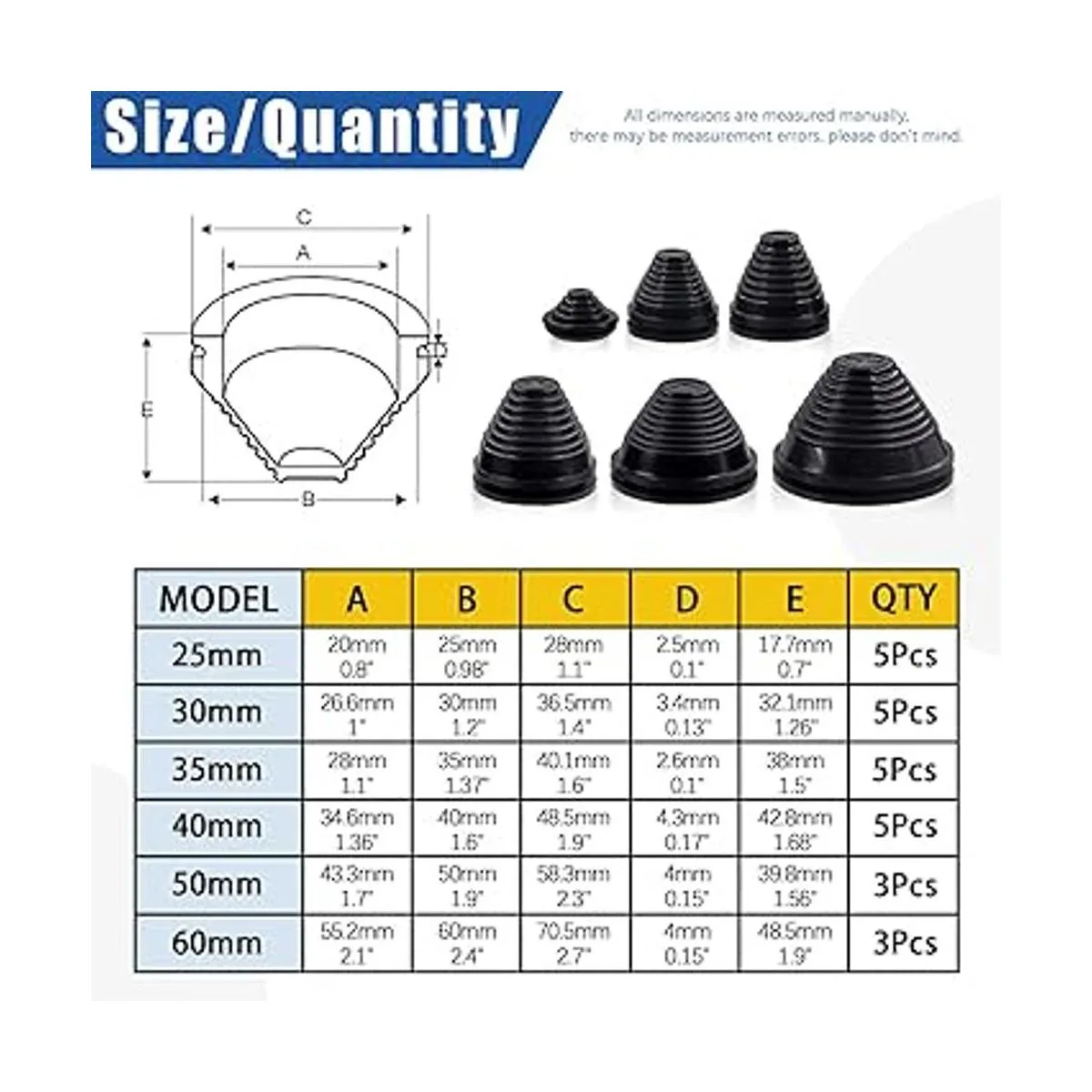 El paquete incluye : recibirás 26 ojales de goma en total, cuya cantidad y tamaño del agujero del taladro son 5 piezas x 0.984 in, 5 piezas x 1.181 in, 5 piezas x 1.378 in, 5 piezas x 1.575 in, 3 piezas x 1.969 in, 3 piezas x 2.362 in. Puedes encontrar fácilmente el tamaño adecuado de este kit, y las cantidades suficientes se pueden utilizar durante mucho tiempo.