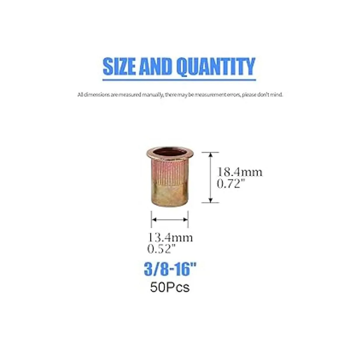 Tamaño de la tuerca de remache: en este juego incluye 50 tuercas de remache de 1/420UNC para tu trabajo, el tamaño del agujero de taladro es de 0.528 in, la longitud total es de 0.724 in.