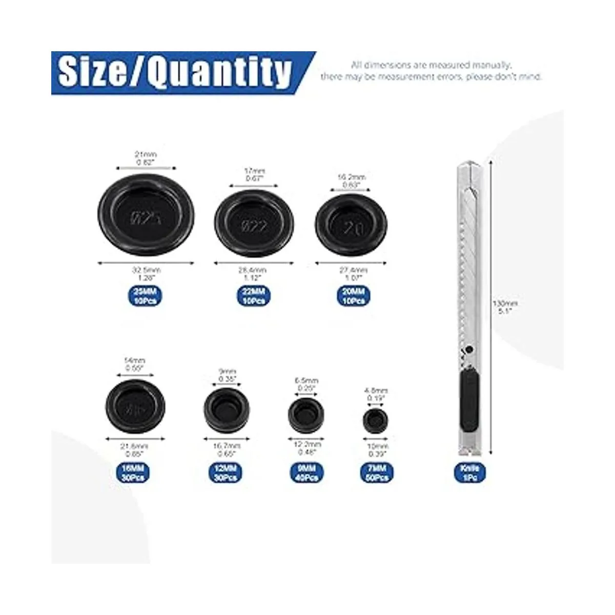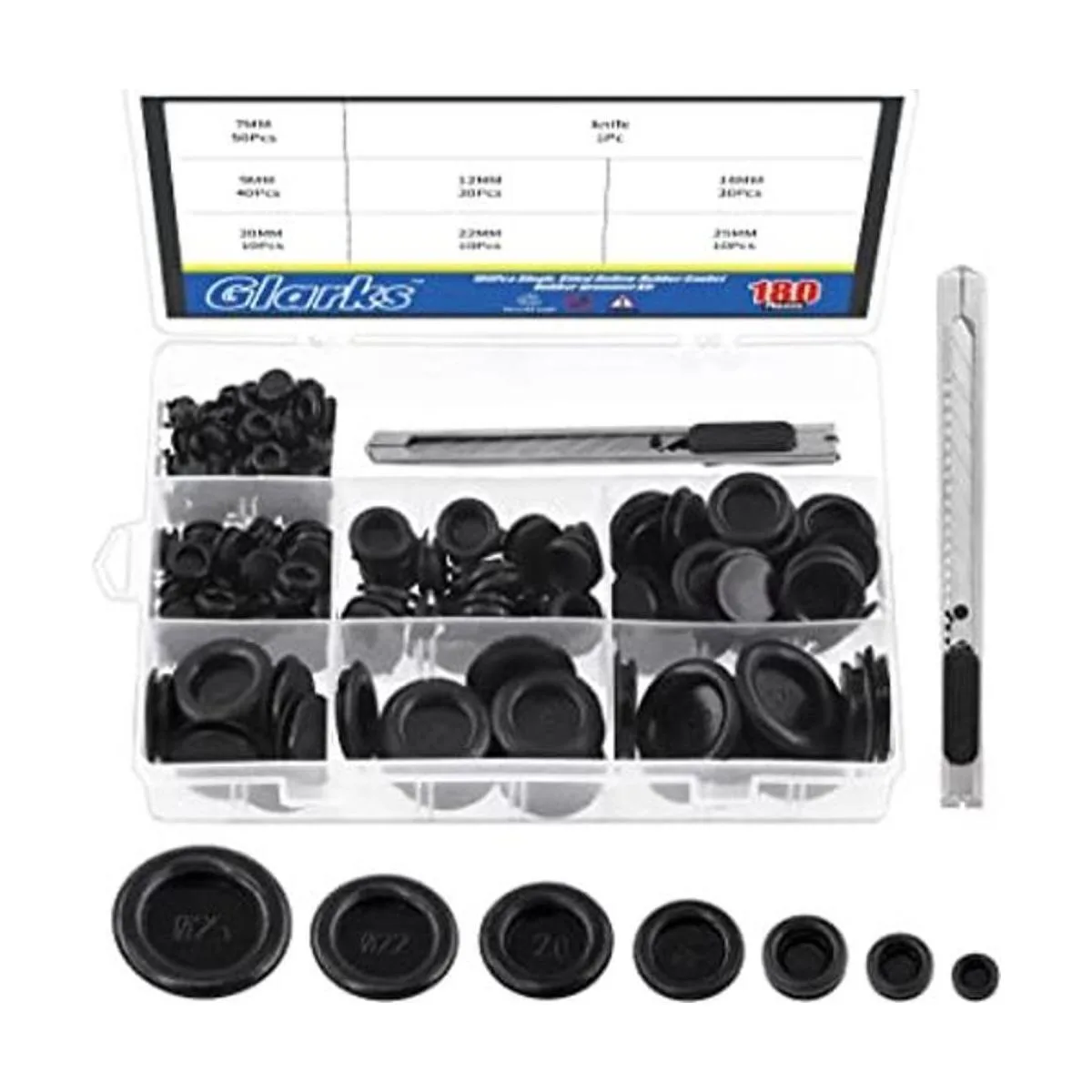Glarks Surtido de ojales de goma cerrados de 181 piezas, juego de conectores de orificio de cortafuegos de 7 tamaños, junta de cable eléctrico con 1 cuchillo retráctil para alambre, enchufe, automoción, fontanería