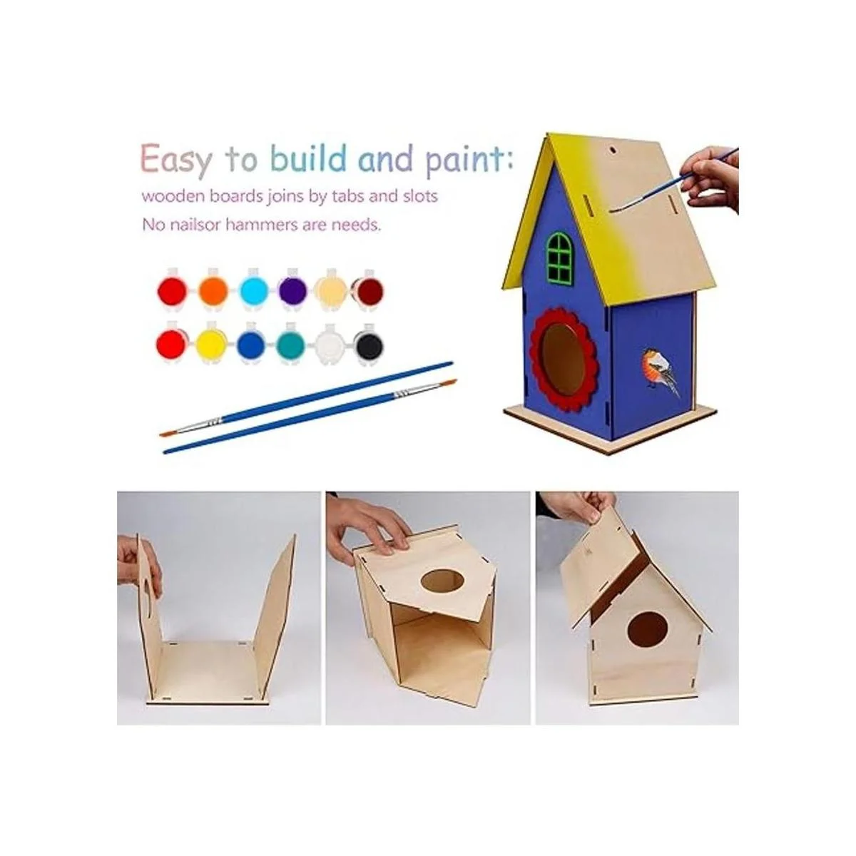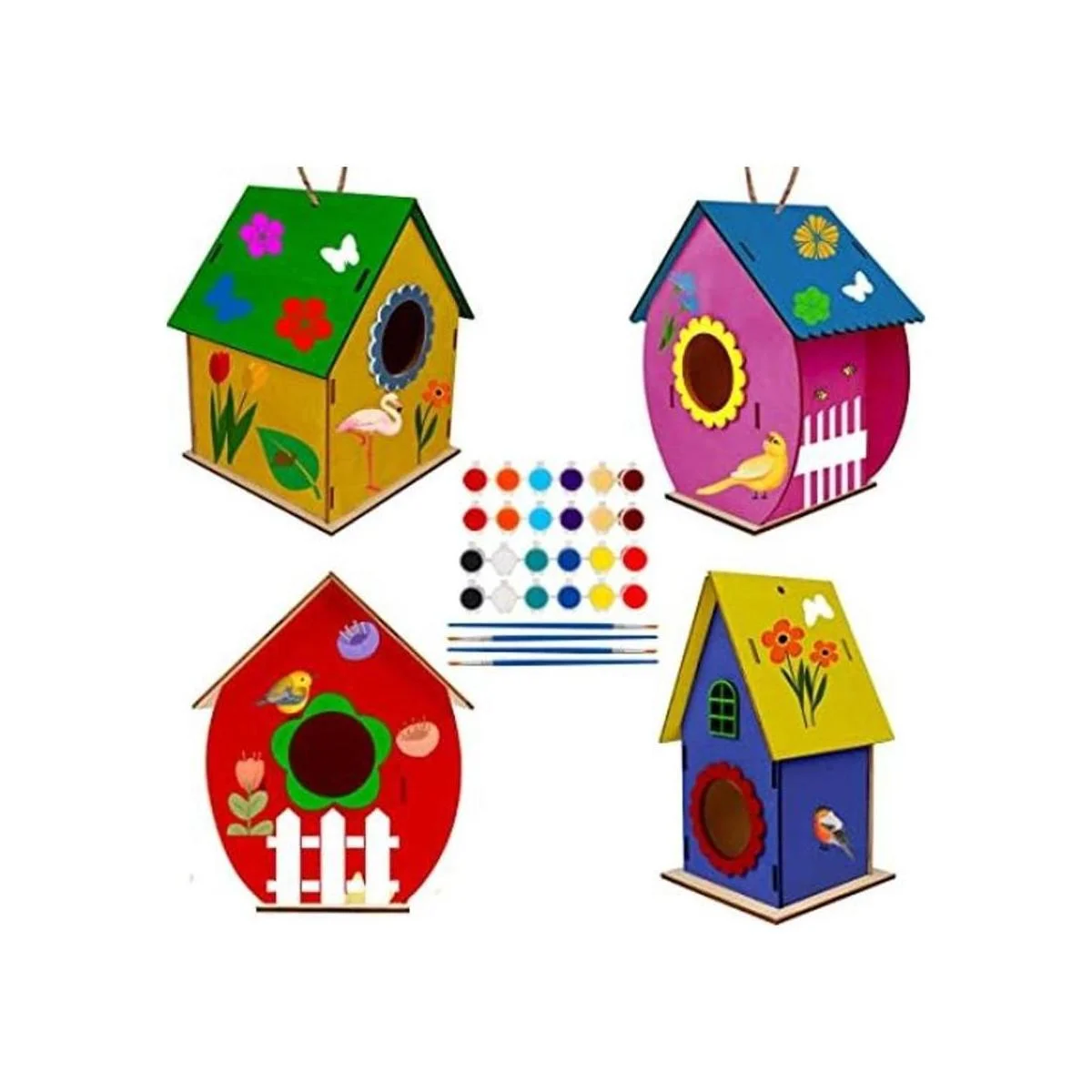 Glintoper Juguetes de madera para manualidades de arte para niños, paquete de 4 piezas de bricolaje para casa de pájaros, rompecabezas de pintura de bricolaje, montaje de madera, construcción y pintura, casa de pájaros, incluye pinturas y pinceles, arte de madera para niñas y niños pequeños