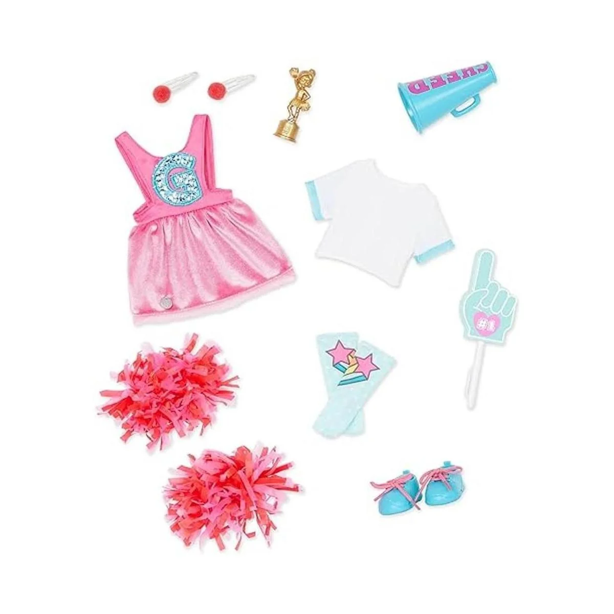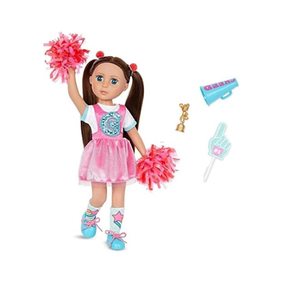 Glitter Girls Alfie Muñeca de animadora posable de 14 pulgadas, cabello castaño y ojos azules, pompones, vestido de mameluco rosa, pinzas para el cabello, megáfono, juguetes y accesorios de alegría para niños a partir de 3 años