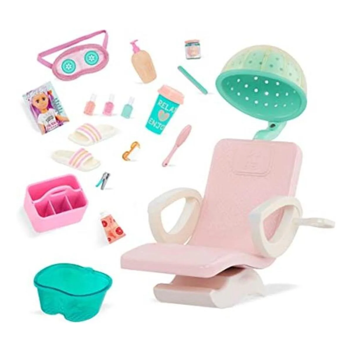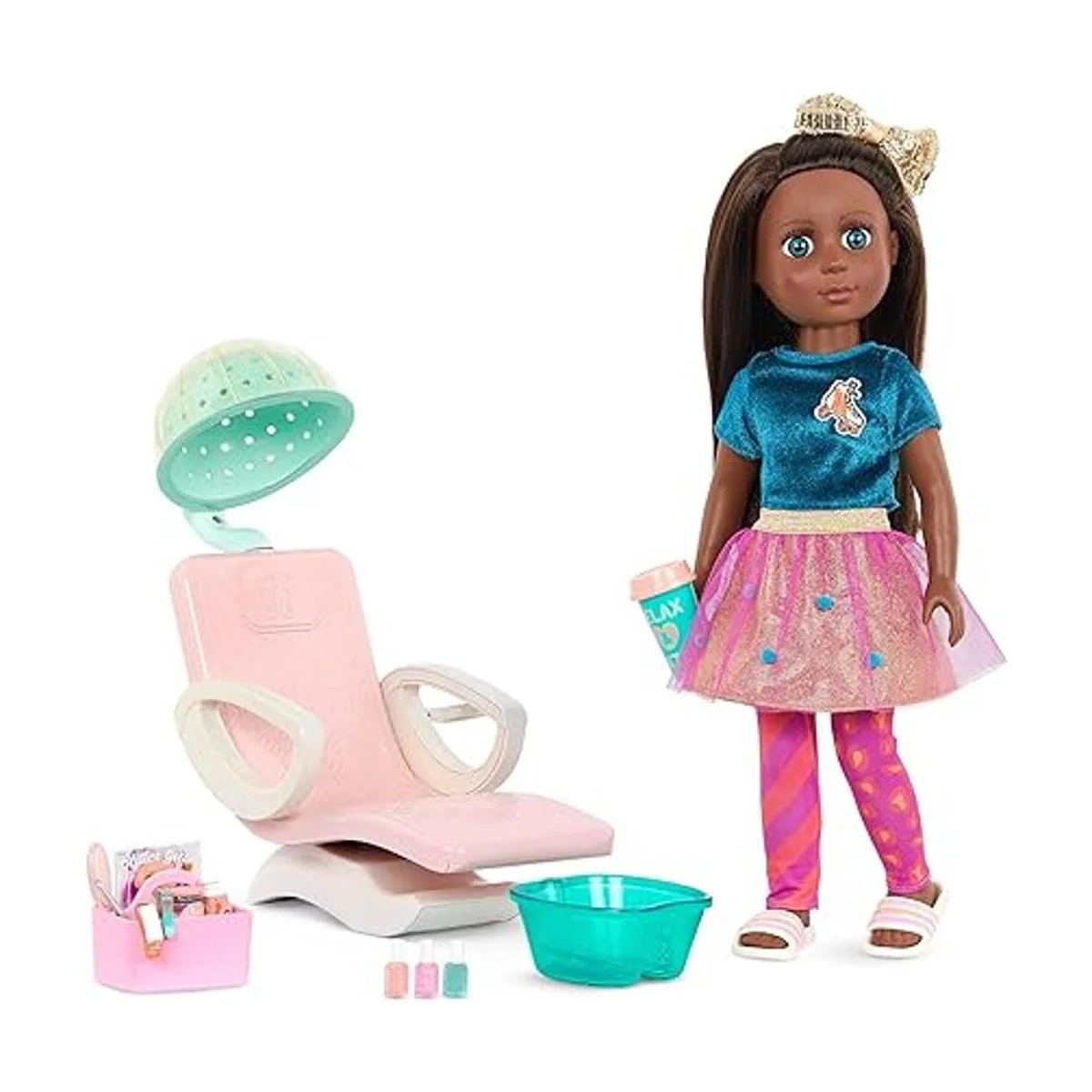 Glitter Girls Silla de salón y juego de peinado Secador de pelo con capucha, baño de pies, esmalte de uñas de simulación Accesorios de muñeca de 14 pulgadas para niños a partir de 3 años Juguetes para niños