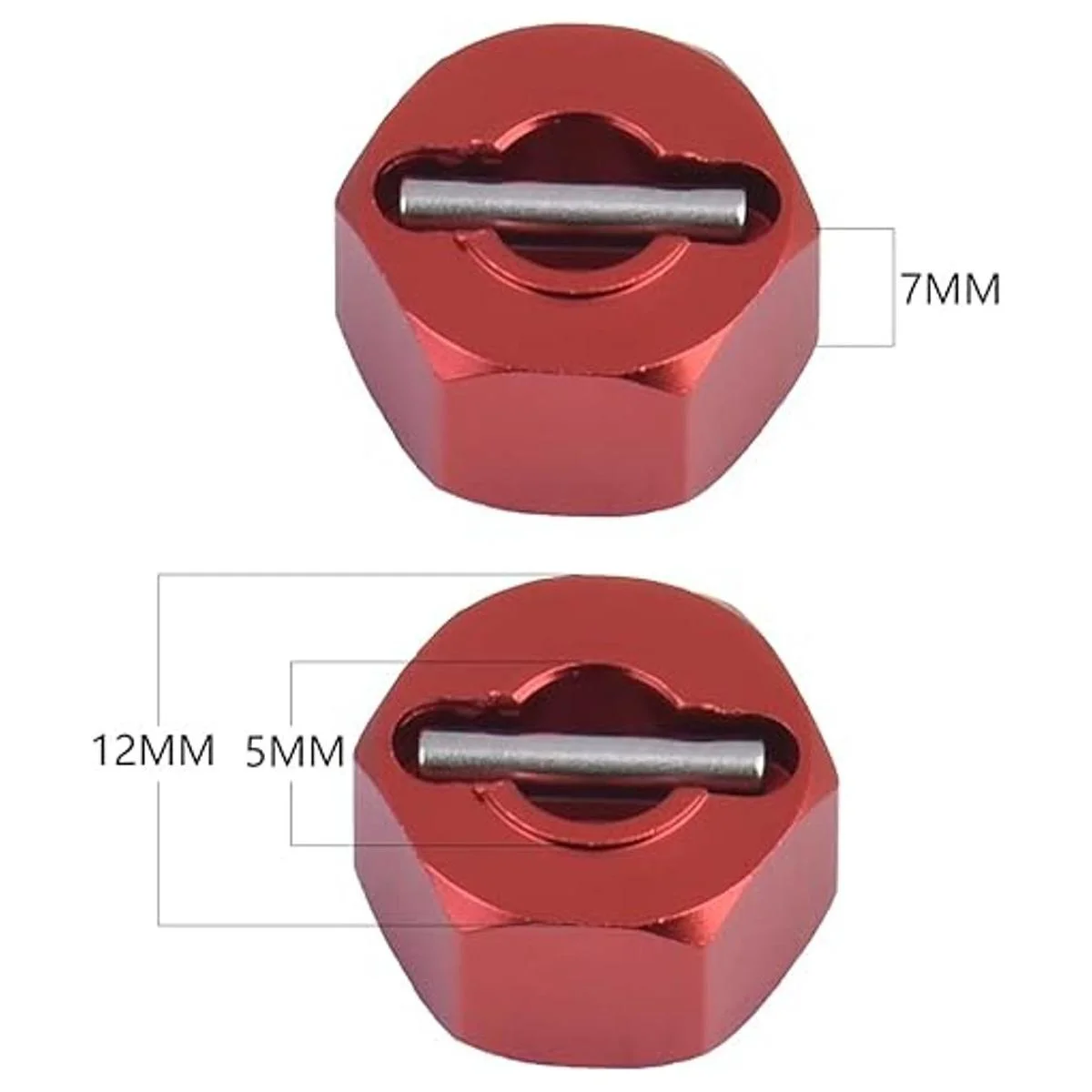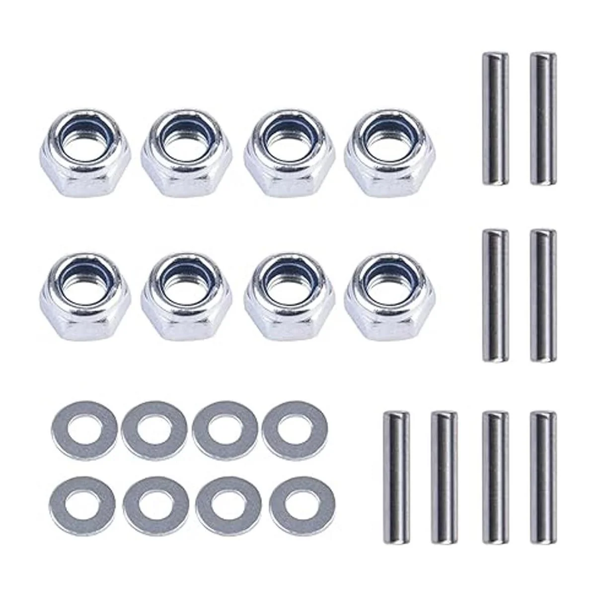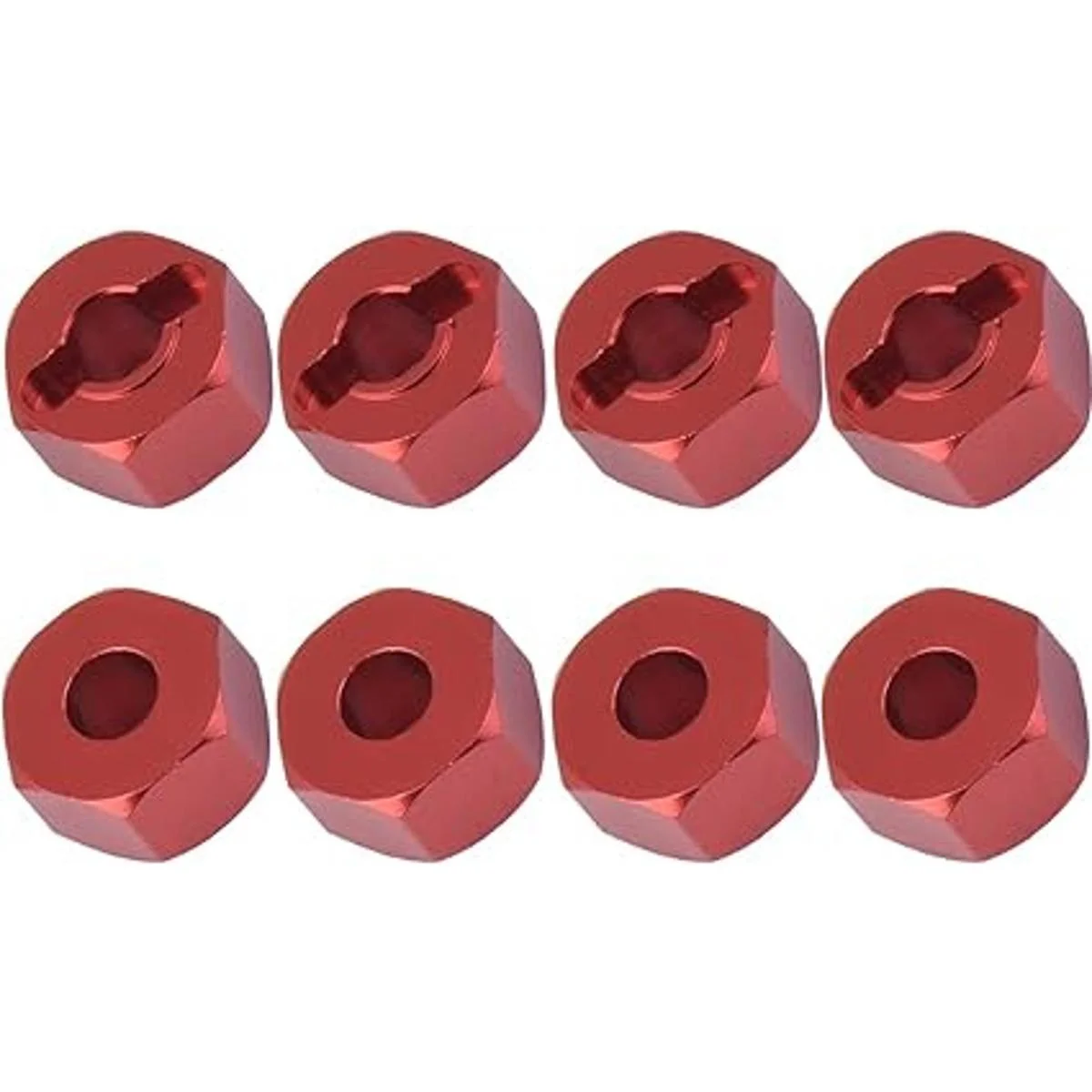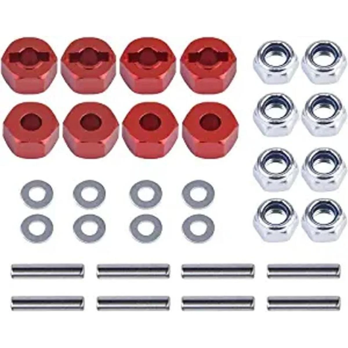 El paquete incluye: 8 cubos de rueda hexagonales, 8 pines de eje, 8 tuercas M4 con brida y 8 arandelas