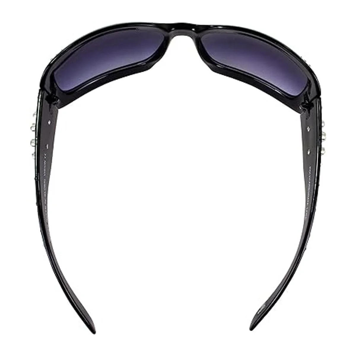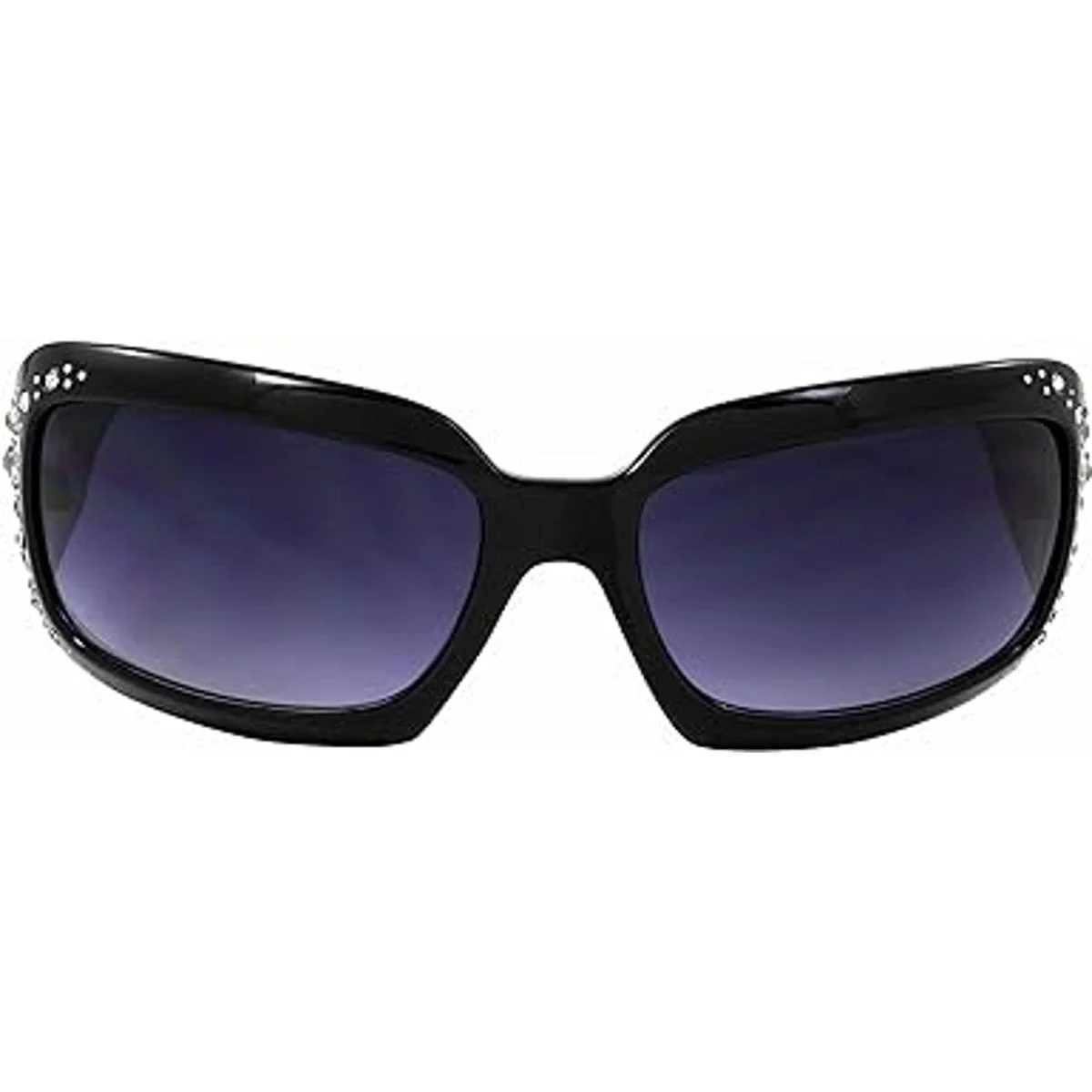 Global Vision Rodeo Queen sunglasses are designed for style, durability, and protection. Their smoke gradient lenses are made from shatterproof polycarbonate and have scratch resistant coating. The shiny black frames are designed with rhinestones, studs, and a silver crown metal piece. All Global Vision Sunglasses are equipped with UV400 Filter for Maximum UV Protection.