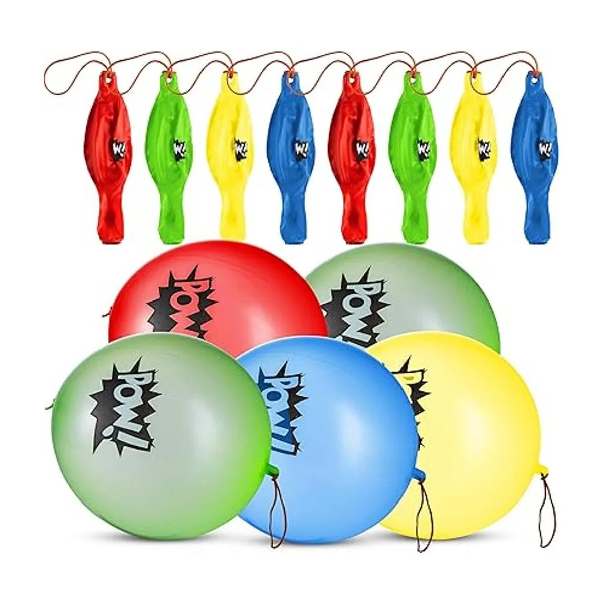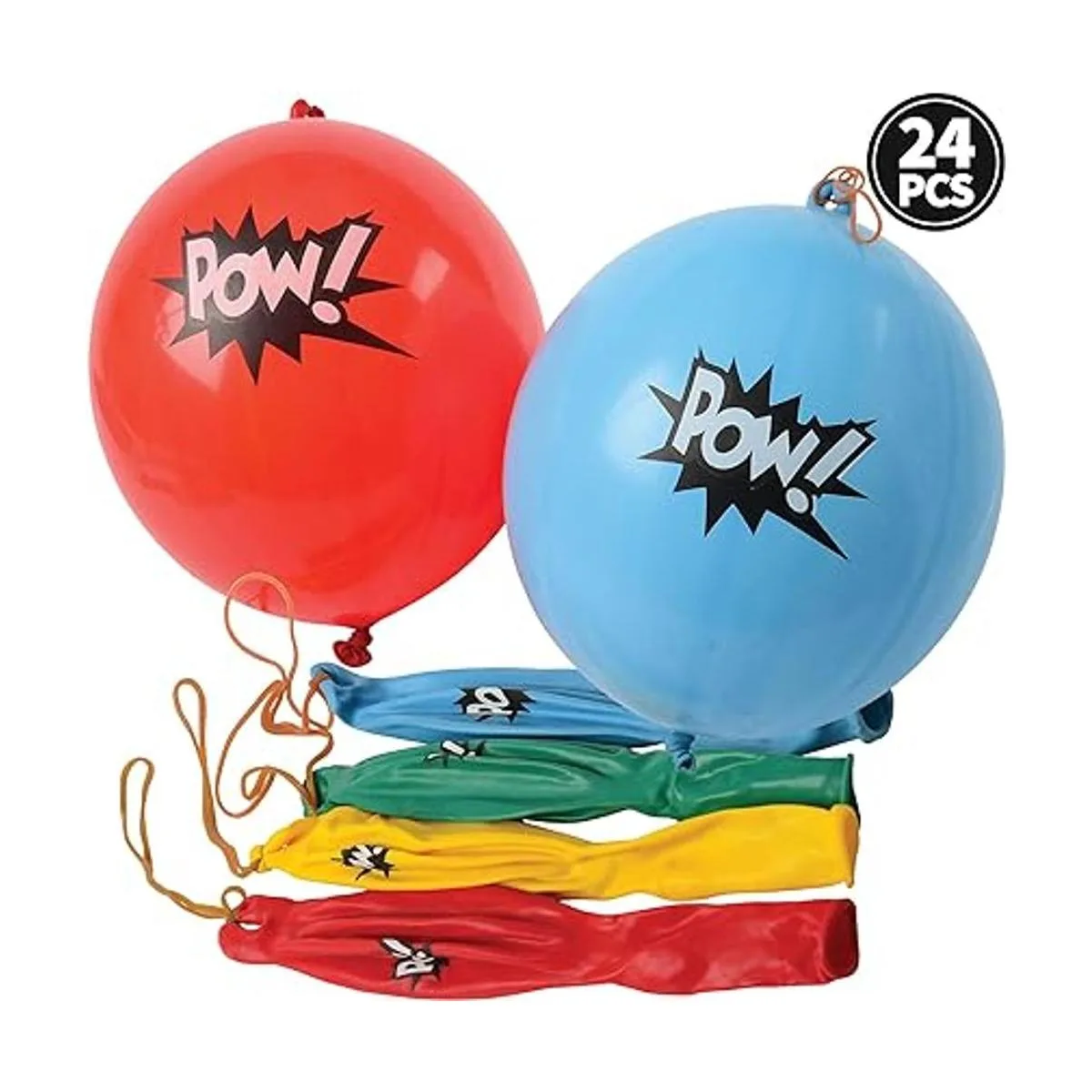 Paquete a granel de 24 globos de boxeo de superhéroes: cada pedido de globos de superhéroe para niños incluye 24 globos de perforación que miden 8.75 pulgadas de longitud cuando se desinflan. Vienen en varios colores, incluyendo azul, verde, amarillo y rojo 6 de cada color con un diseño de cómic POW. Fácil de inflar y atar las asas de goma