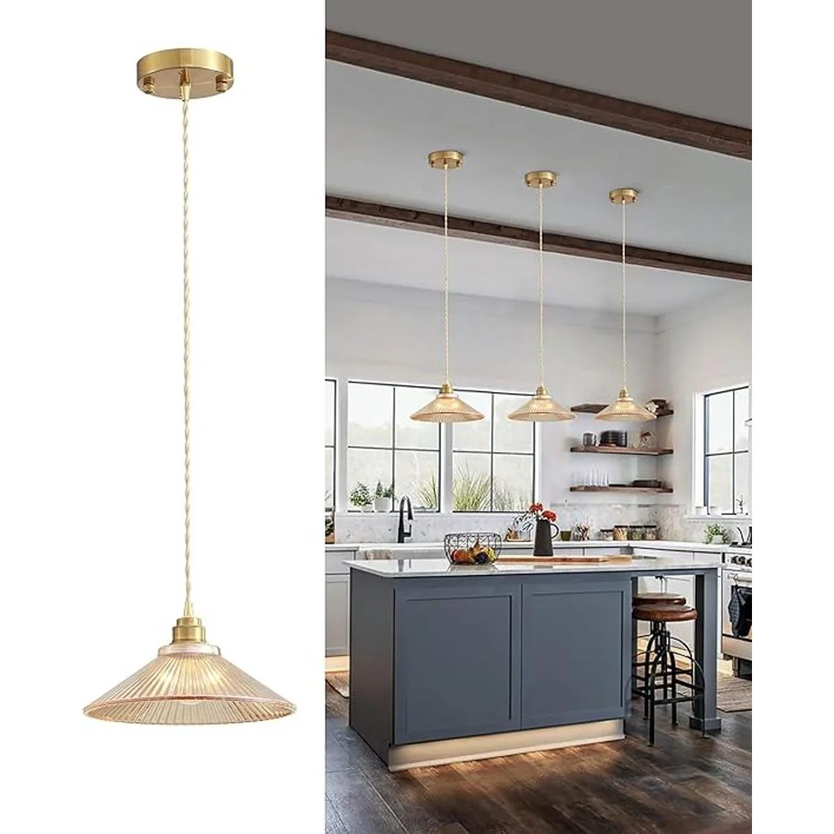 Elegante iluminación de detalles: esta lámpara colgante individual lava tu cocina o comedor en un cálido brillo, con una pantalla de cristal única en forma de paraguas que protege una lámpara cuyo acabado de latón dorado combina bien con decoraciones del hogar, desde granja rústica hasta mediados de siglo hasta minimalista contemporáneo.