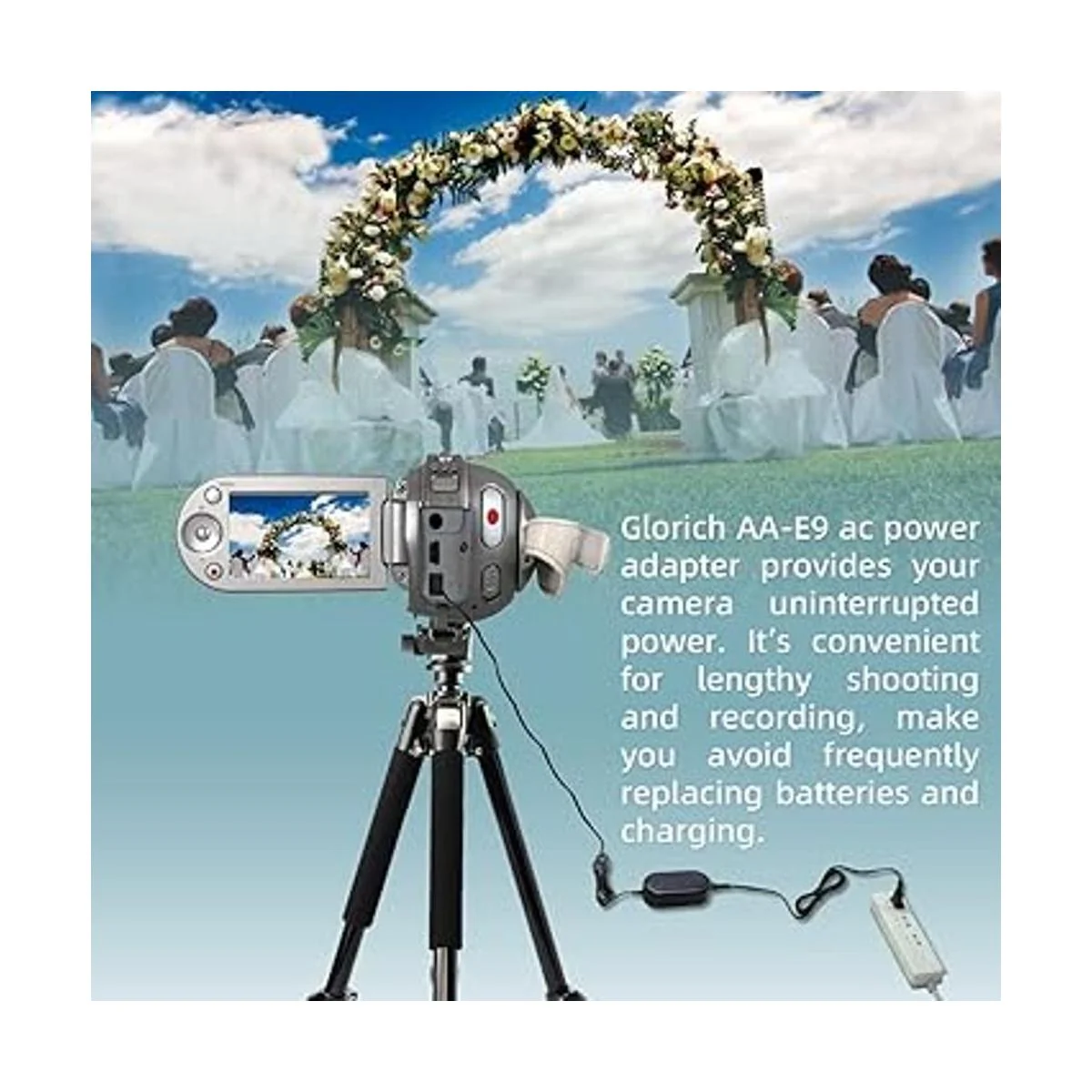 Este kit te permite alimentar tu cámara desde una toma de CA. til para largas sesiones de estudio sin necesidad de reemplazar y recargar varias baterías continuamente