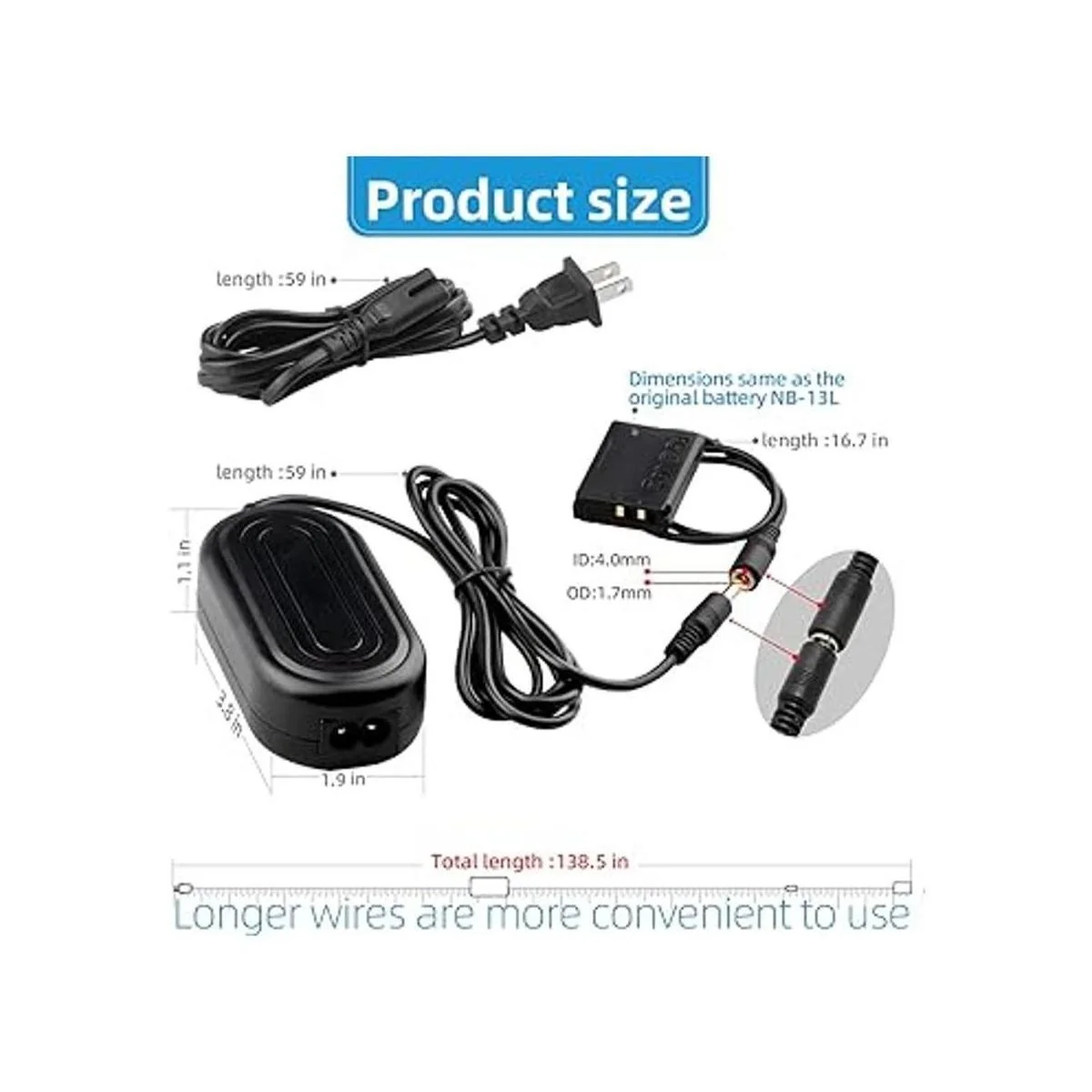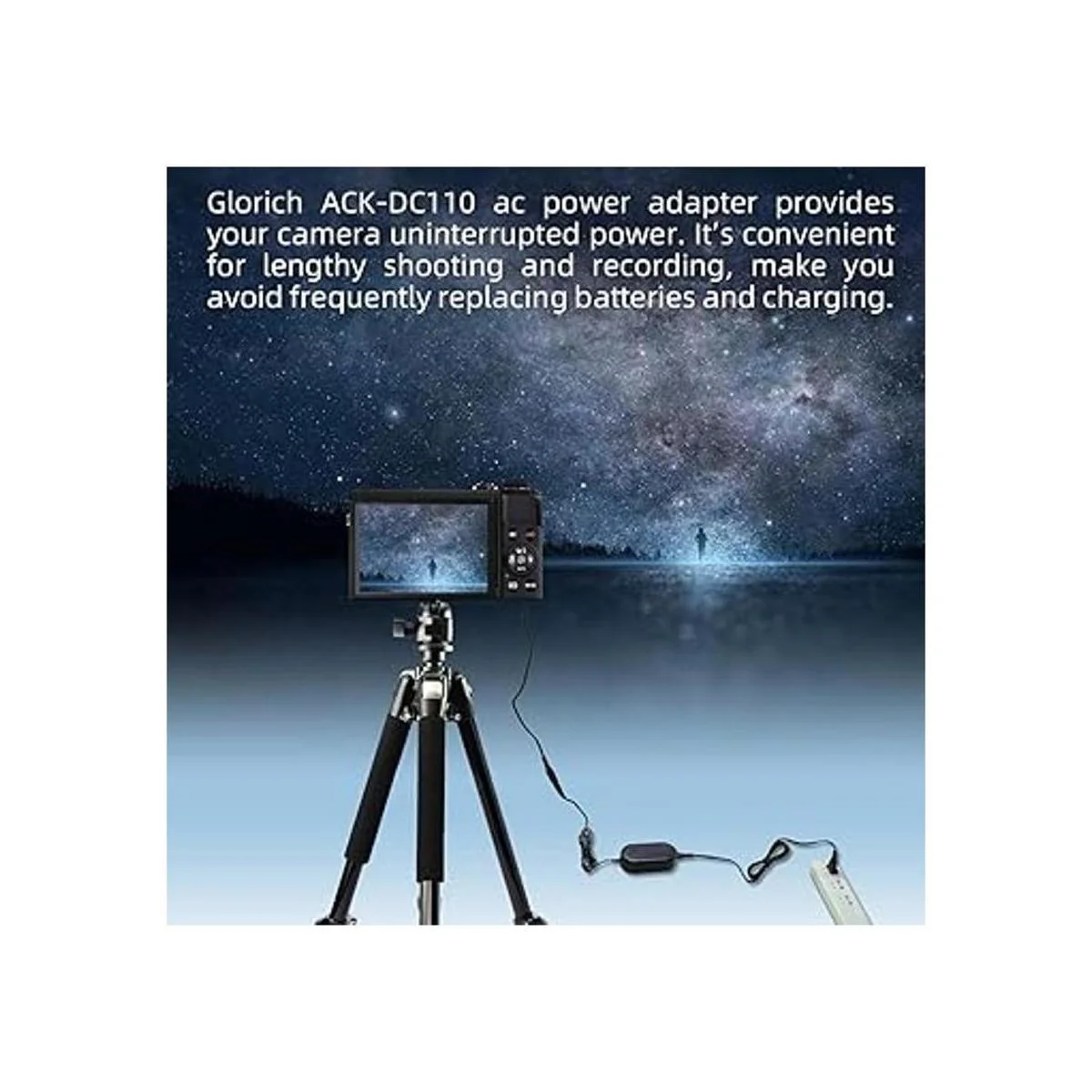Este kit le permite alimentar tu cámara desde una toma de corriente alterna. útil para largo Studio brotes con baterías sin necesidad de sustituir y recargar continuamente múltiples