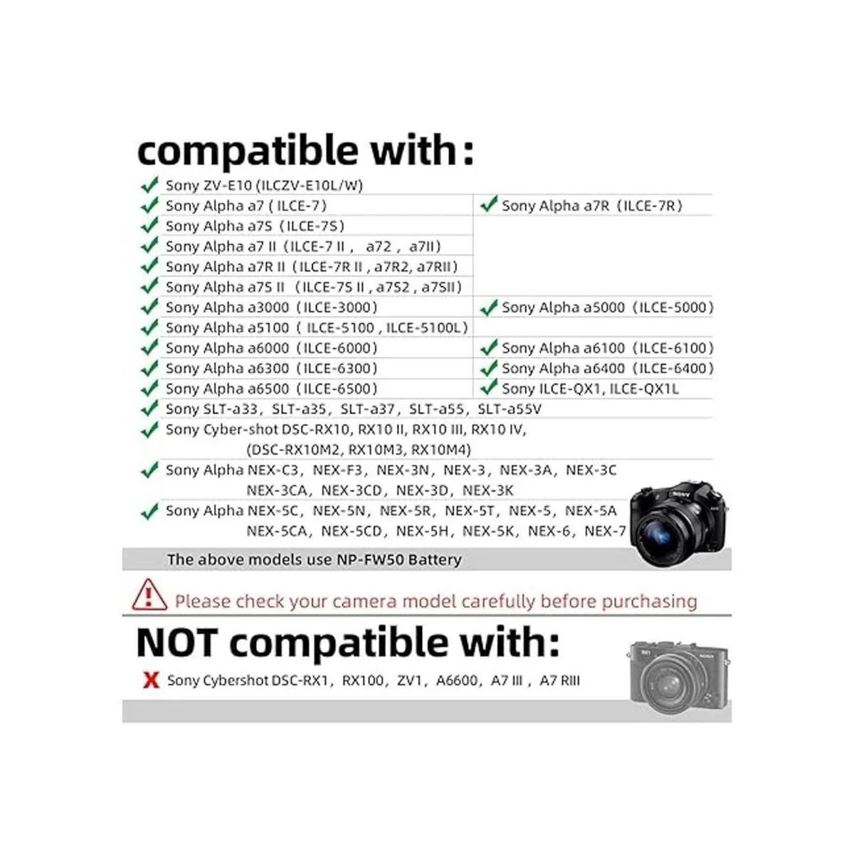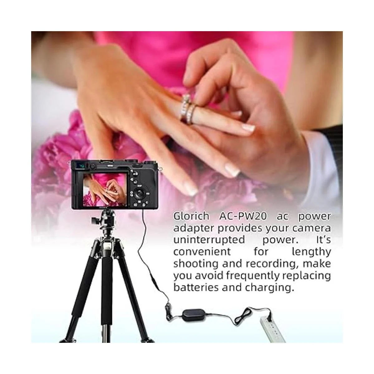 Glorich ACPW20 Adaptador de corriente CA NPFW50 Batería falsa compatible con cámaras Sony Alpha ZVE10 A7 A7R A7S A7II A7RII A7SII A6500 A6400 A6300 A6100 A6000 A5100 A5000 RX1III III NEX3 NEX5 NEX7