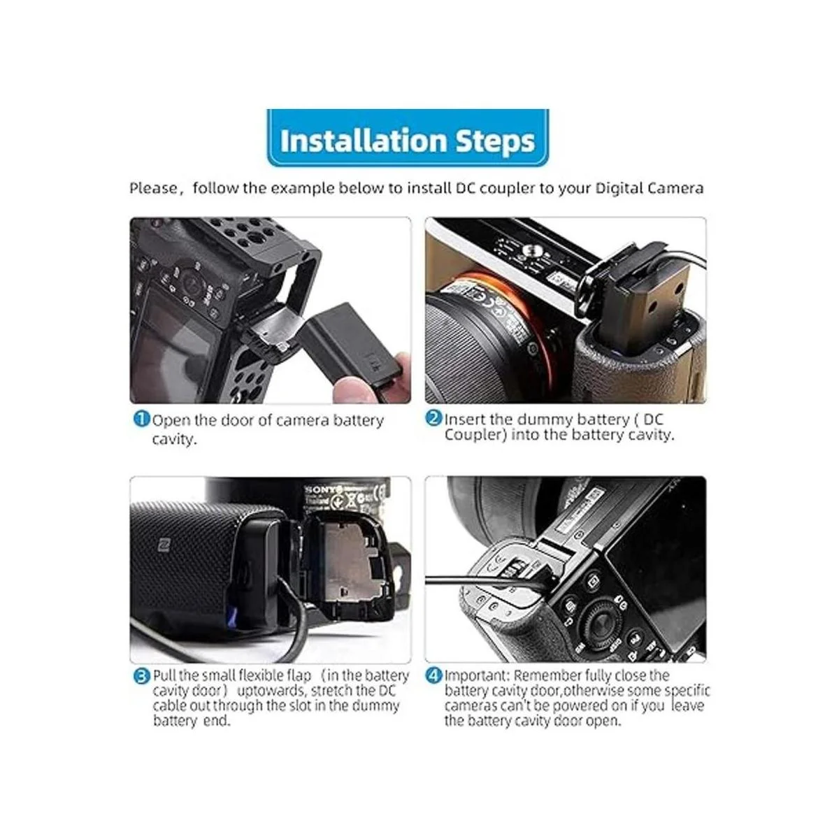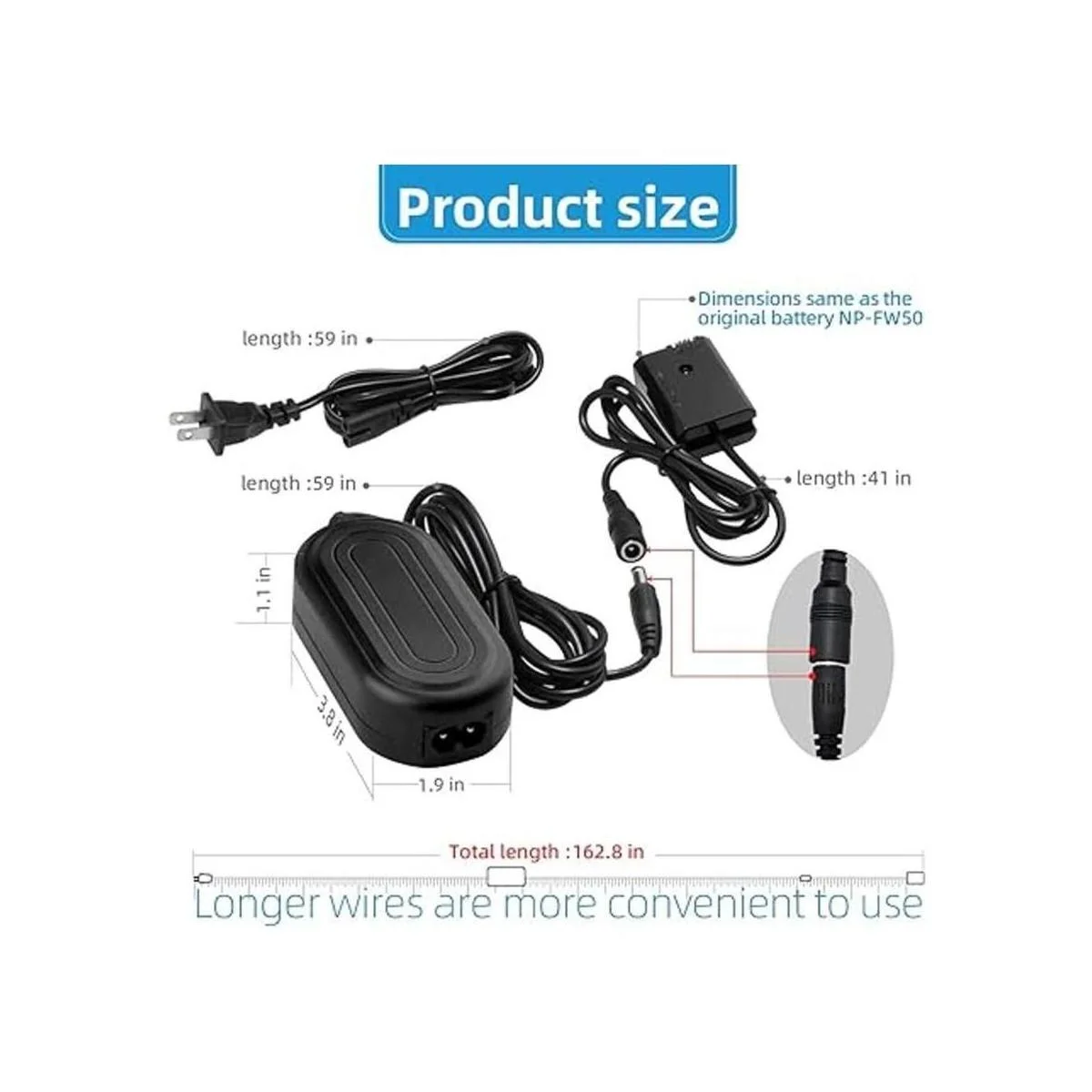 Incluye una batería falsa / acoplador CC conector para reemplazar NPFW50 y un cable de alimentación de CA de 4.9 ft de largo