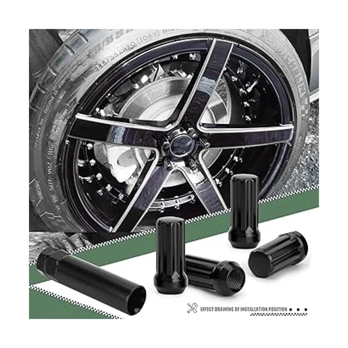 Tamaño: rosca M14 x 1,5 de 0.551 in y 1,5, tuercas de llanta estilo asiento de bellota, asiento cónico de 60 grados, 2 pulgadas de altura negro. 2 llaves de enchufe para instalación hexagonal de 0.827 in y 0.866 in